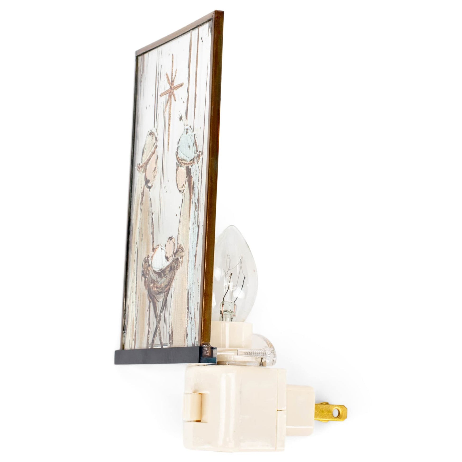 Elegantly designed plastic night light featuring Holy Family. Measures 4" L X 1.75" W X 6.25" H. UL certified and requires C7 bulb. Design by Artist HALEY BUSH, COMPLEMENTS OF SUZAN LIND ART LICENSING AND DESIGN, LLC