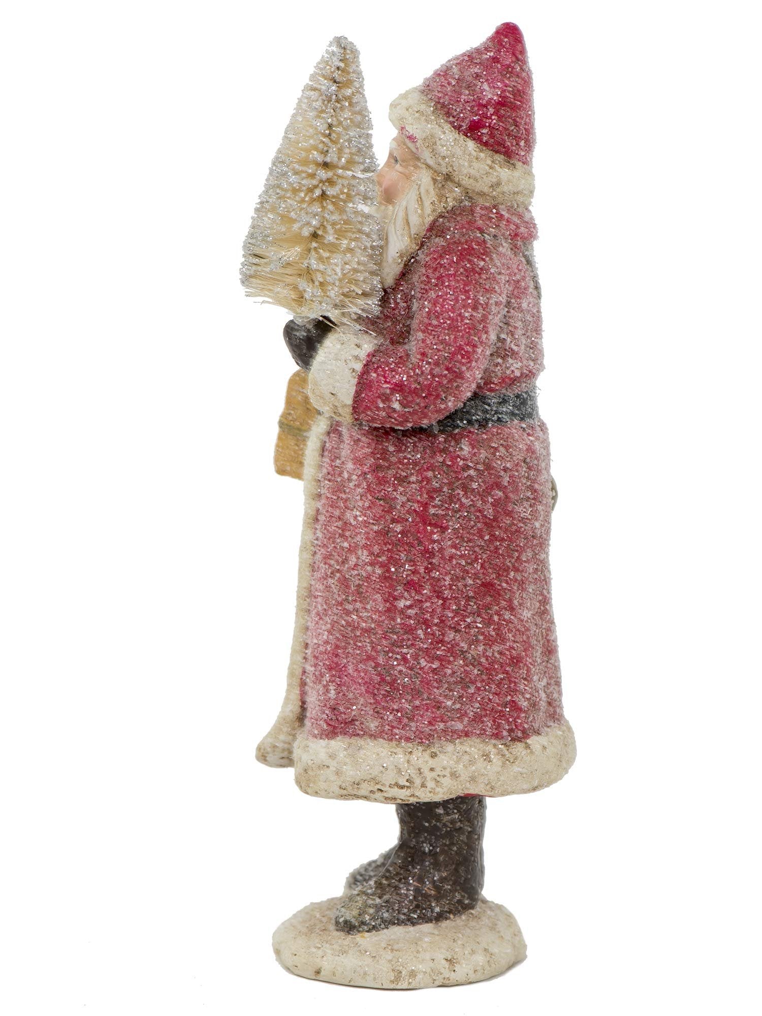 This charming old-world Santa features the big guy holding a bottle brush tree and gifts, and his warm winter coat is covered in a little glitter. The look is cute and fits in nicely with a vintage style of Christmas decorating. The body of this figurine is made of resin. Made by Raz Imports, this Santa measures 8.5" tall by 3.5" wide. Each one is sold separately, so you can choose your color.Pretty Santa figure with old European style