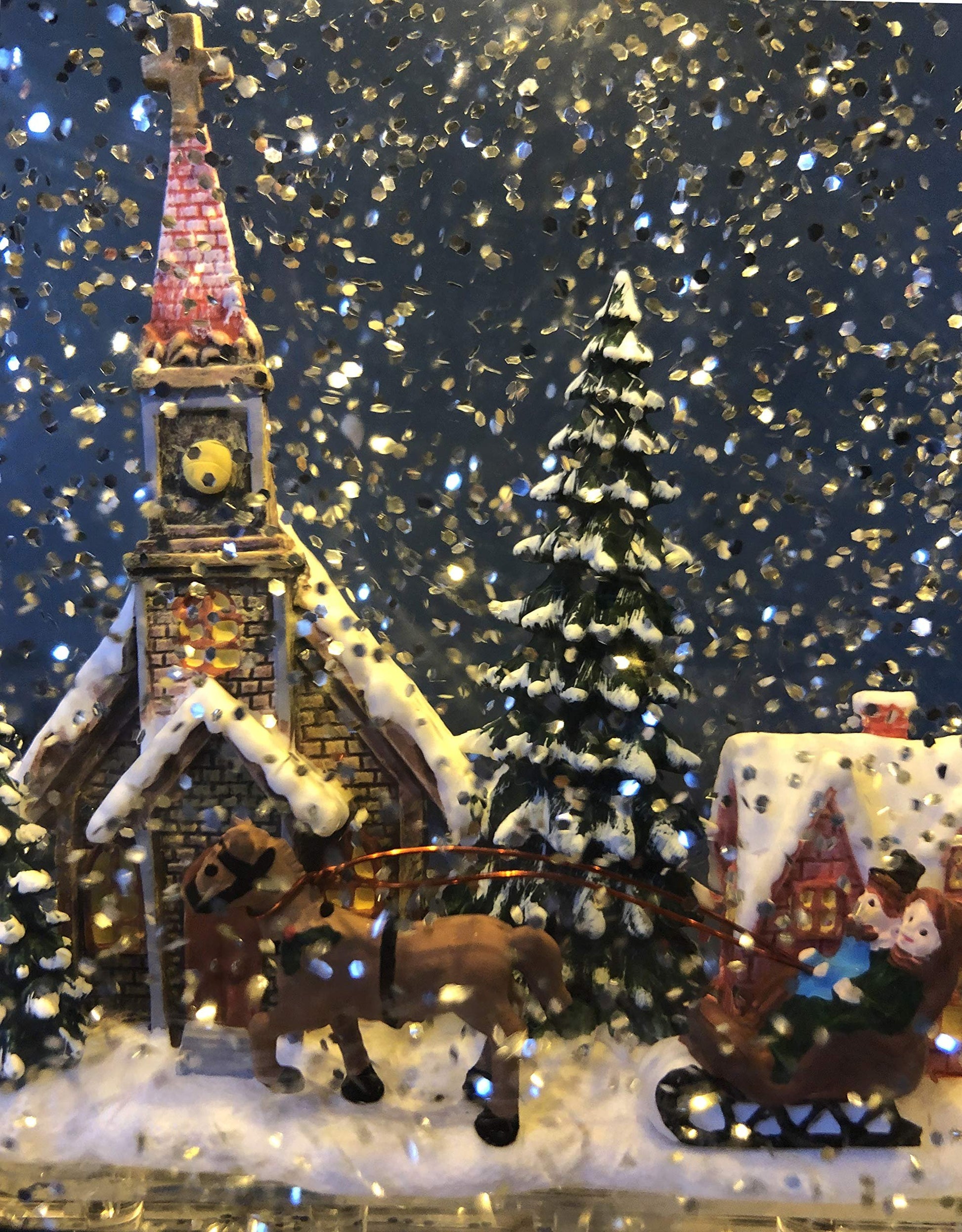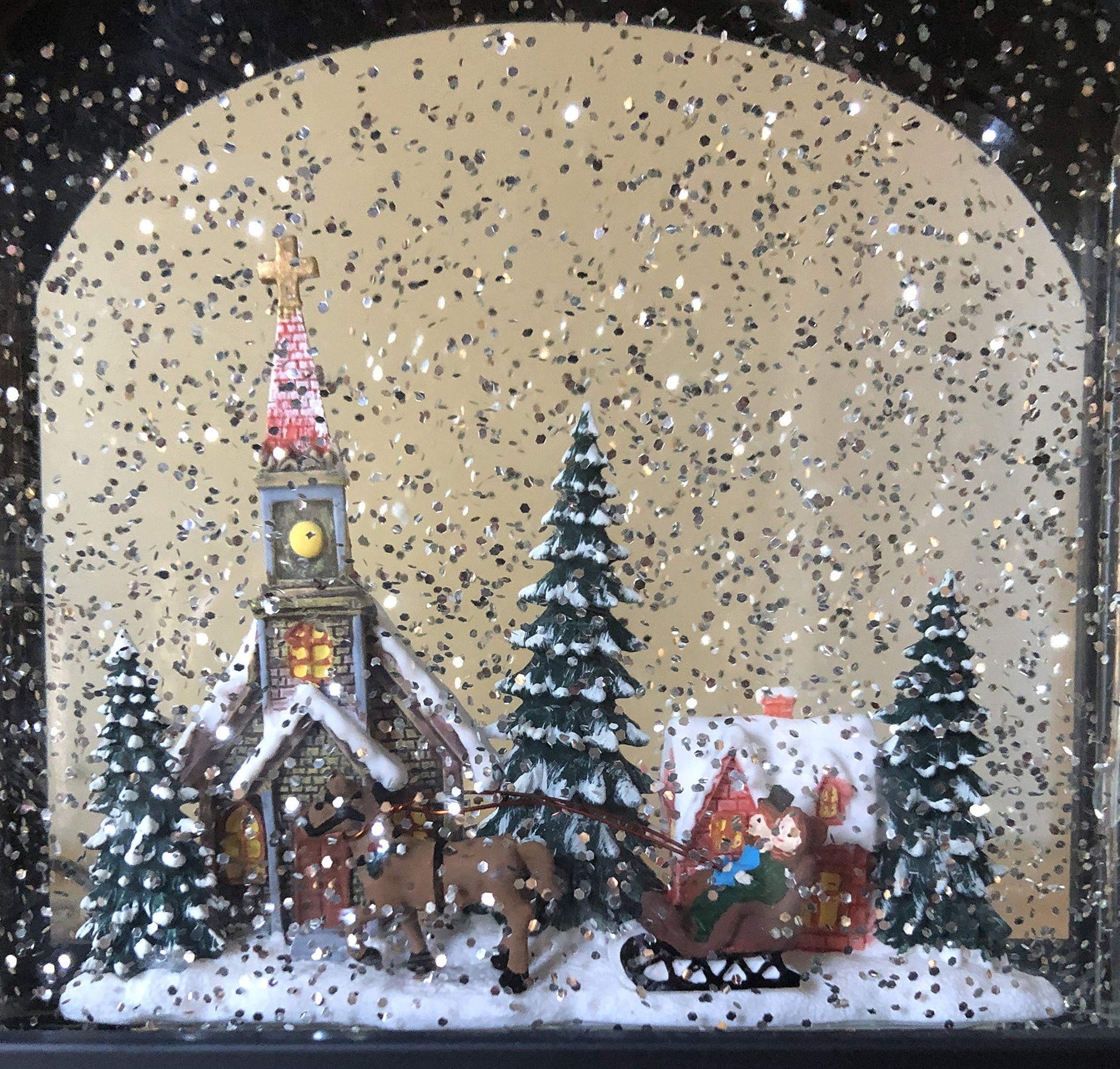 This light up water lantern depicts a sweet, old fashioned town scene featuring a romantic ride down Main Street in a horse drawn sleigh, a cozy cottage, an illuminated Church, and towering snow covered evergreen trees. All the while, glittery snow magically swirls through the winter scene, no shaking required. A special feature of this water lantern is the 7 classic and entertaining carols it plays, including Jingle Bells, Silent Night, Deck the Halls, Joy to the World, and more. Song portions play in a loop with full electronic instrumentation of horns, piano and music box tones. You will enjoy displaying this special water lantern year after year. Measuring approximately 11 inches tall, it is ideal for displaying on a table, shelf, or fireplace mantel. Made from acrylic plastic with a black finish.HOLIDAY MEMORIES: This light up water lantern depicts a sweet, old fashioned town scene featuring a romantic ride down Main Street in a horse drawn sleigh, a cozy cottage, an illuminated Church, and towering snow covered evergreen trees. All the while, glittery snow magically swirls through the winter scene, no shaking required.MUSIC BOX OPTION: A special feature of this water lantern is the 7 classic and entertaining carols it plays, including Jingle Bells, Silent Night, Deck the Halls, Joy to the World, and more. Song portions play in a loop with full electronic instrumentation of horns, piano and music box tones.TURNS ON AND OFF AUTOMATICALLY: With the built in timer you can enjoy this charming addition to your holiday decor with 6 hours on and 18 hours off. It will relight each day at the same time to activate a display of sparky, swirling glitter. The lantern styled snow globe uses 3 AA batteries (not included) or can be powered with the included USB cord.DELIGHTFUL TO DISPLAY: You will enjoy displaying this special water lantern year after year. Measuring approximately 11 inches tall, it is ideal for displaying on a table, shelf, or fireplace mantel. Made from acrylic plastic with a black finish.A SPELLBINDING SHOW: This beautiful RAZ Imports water lantern features continuously swirling glitter for a delightfully eye catching and mesmerizing show. Lovely as winter decor or display it year round to instantly uplift your spirts.