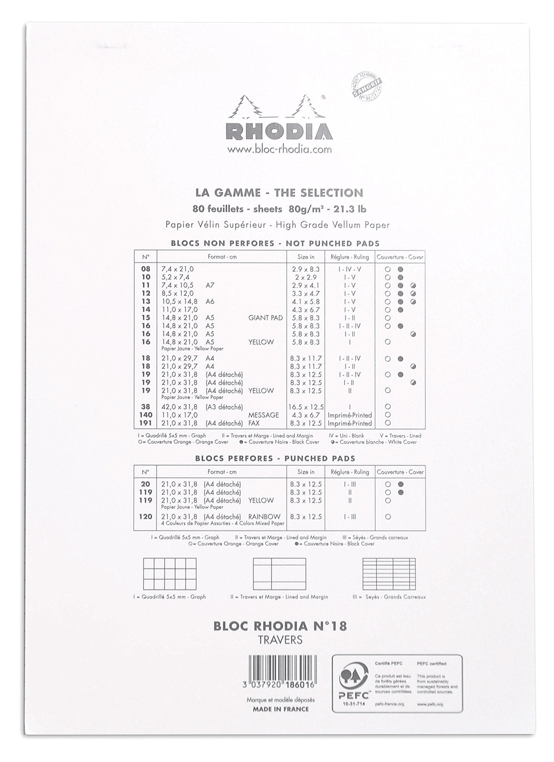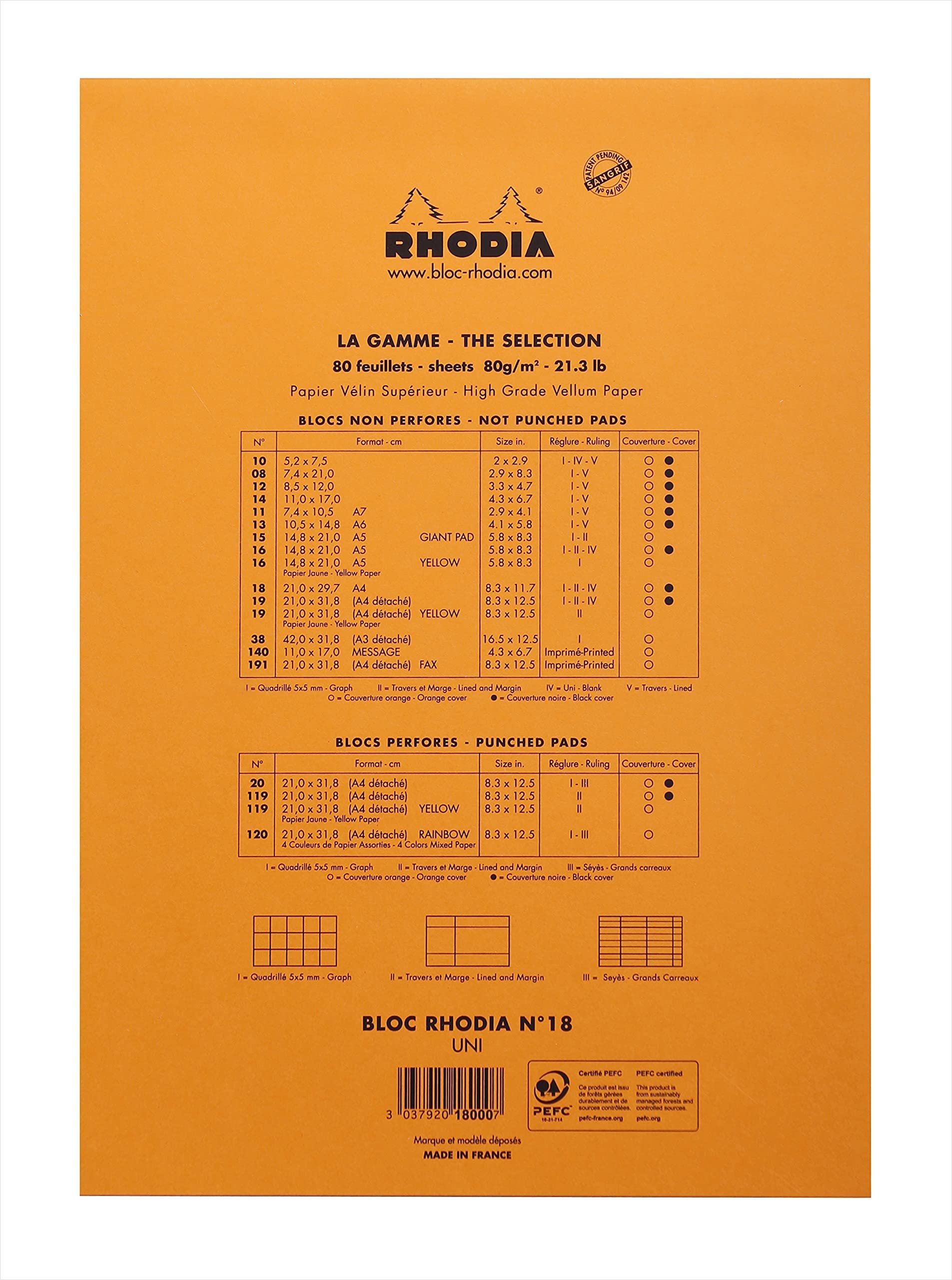 Rhodia Head Stapled Pad, No11 A7, Lined - OrangeA7/ 74x105mm in sizePaper within the notepad is made from Clairefontaine 80g Superfine Vellum80 detachable microperforated sheetsCardboard back and the ruling is in greyLined paper