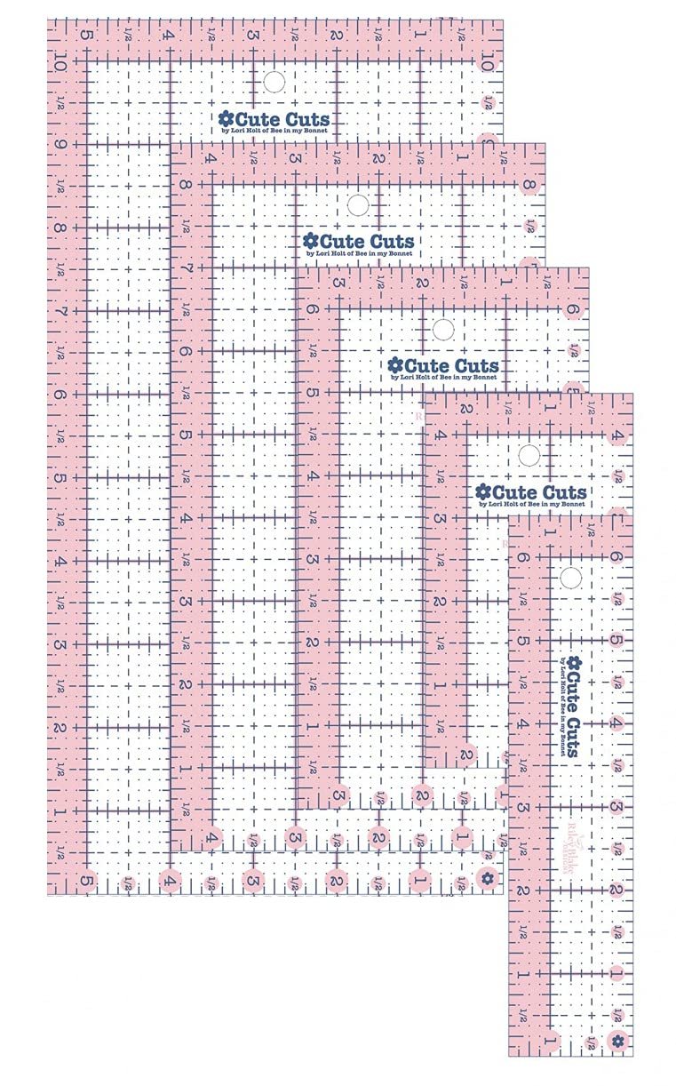 Cute Cuts Rectangular Rulers Riley Blake Designs by Lori Holt of Bee in my Bonnet Ruler sizes: (1.5x6.5), (2.5x4.5), (3.5x6.5), (4.5x8.5), (5.5x10.5). Non-Slip Backing