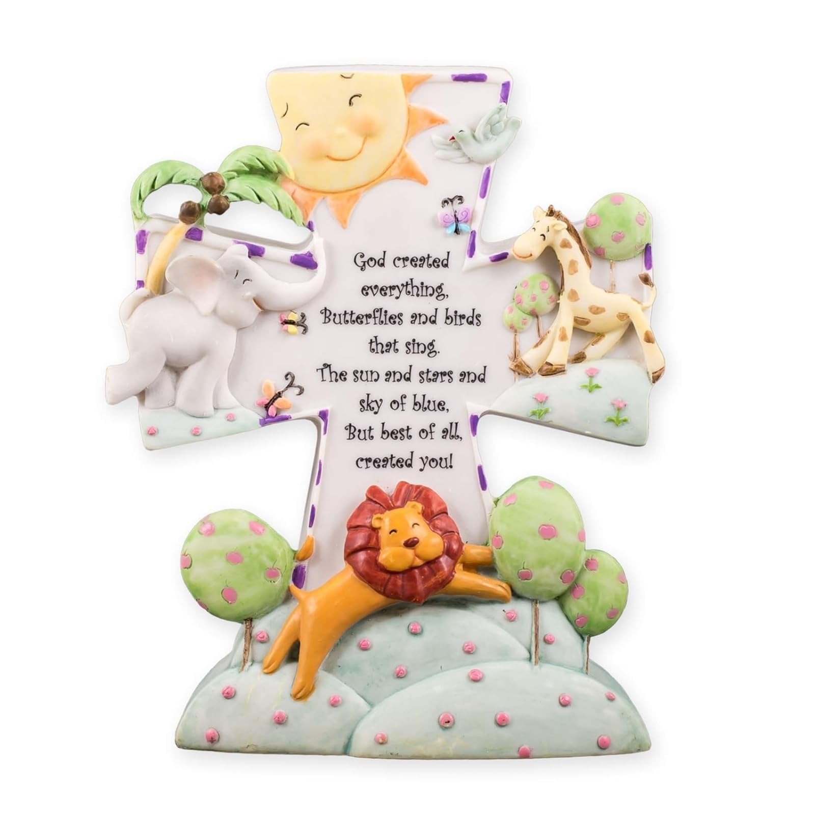 Roman is a leading producer and exclusive distributor of more than 6,000 gifts and decorative accessories. Started in 1963, it is among the largest privately owned and operated firms in the industry. Roman offers a vast array of Christmas decorations and a wide range of inspirational, special occasion, and year-round giftware. In addition, Roman is known for its collections that include Fontanini Heirloom Nativity, the Joseph’s Studio Collection, Alexa’s Angels, Music Boxes by Roman, and Roman Lights.Inspiring Nursery Decor: Beautiful 6.5-inch cross nightlight featuring the comforting message "God Created Everything," perfect for a baby's nursery, child's room, or playroom.Plays Soothing Melody: Gently plays a calming tune, perfect for lulling babies to sleep or creating a peaceful atmosphere.Excellent Religious Gift Idea: This item makes a great gift to give for any religious holiday, receiving sacrament celebrations, birthday occasions, or house warming blessings.Meaningful Christian Gift: An ideal present for baptisms, baby showers, dedications, birthdays, or any special occasion celebrating a new life and faith.High-Quality Craftsmanship: Made by Roman, a trusted name in religious gifts and décor, ensuring durability and lasting beauty.