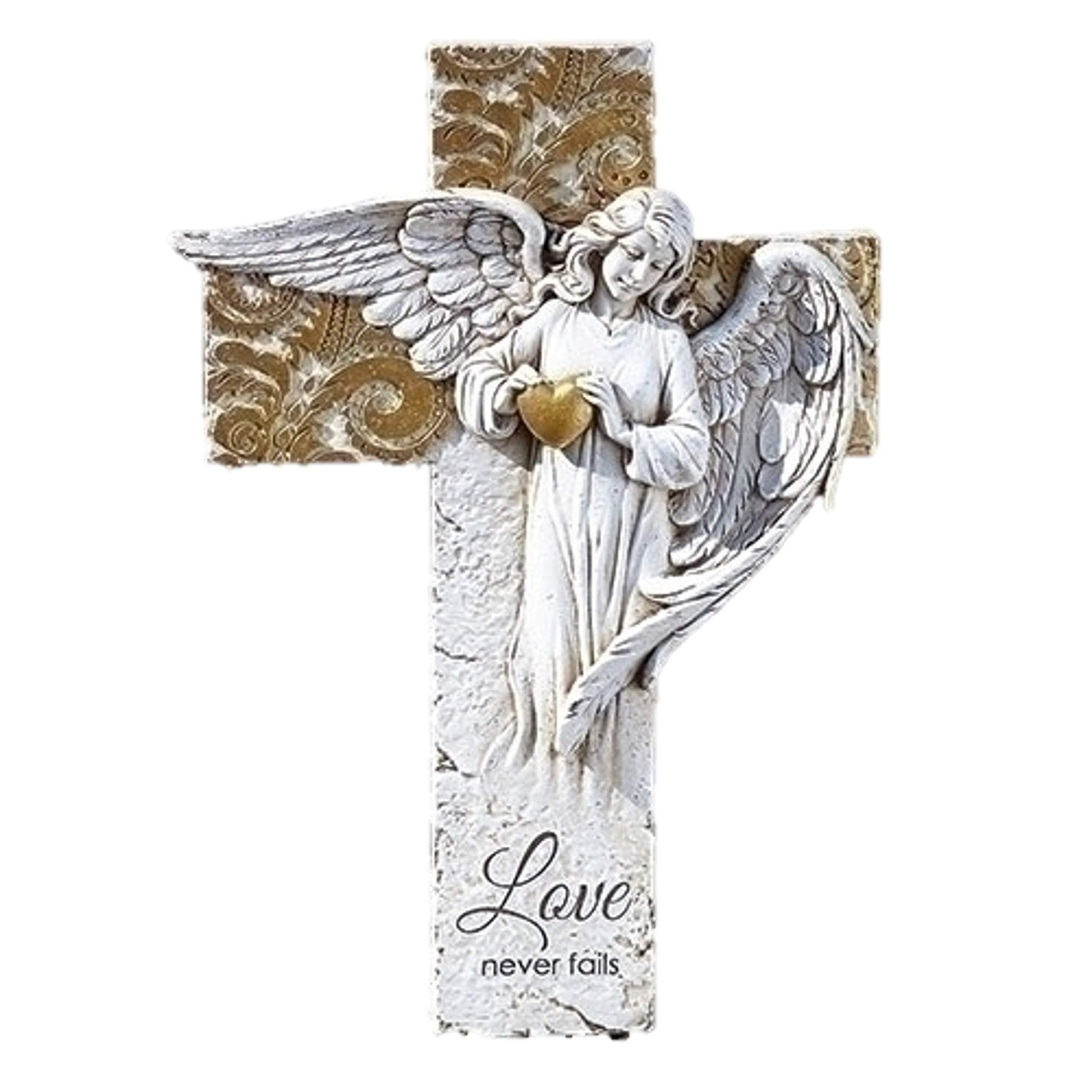 Roman Angel on Cross with Gold Heart Garden Statue,12-inch Height