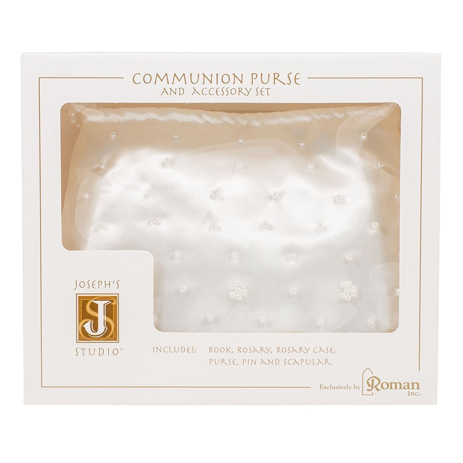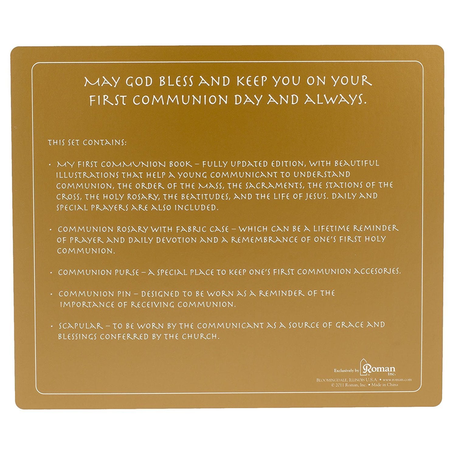 Set includes a Prayer Book, lapel pin, rosary, scapular, beaded pouch and a beaded purse. My First Communion Book - contains beautiful illustrations that help a young communicant to understand Communion, the Order of the Mass, the Sacraments, the Station of the Cross, the Holy Rosary, the Beatitudes, and the Life of Jesus. Daily and special prayers are also included. Communion Rosary - a lifetime reminder of prayer and daily devotion and a remembrance of ones First Holy Communion. Communion Pin - to be worn as a reminder of the importance of receiving Communion. Scapular - to be worn by the Communicant as a source of grace and blessings conferred by the church. It also includes a beaded pouch for holding the rosary and a matching beaded purse to hold everything together. Comes packaged in a nice keepsake box.
