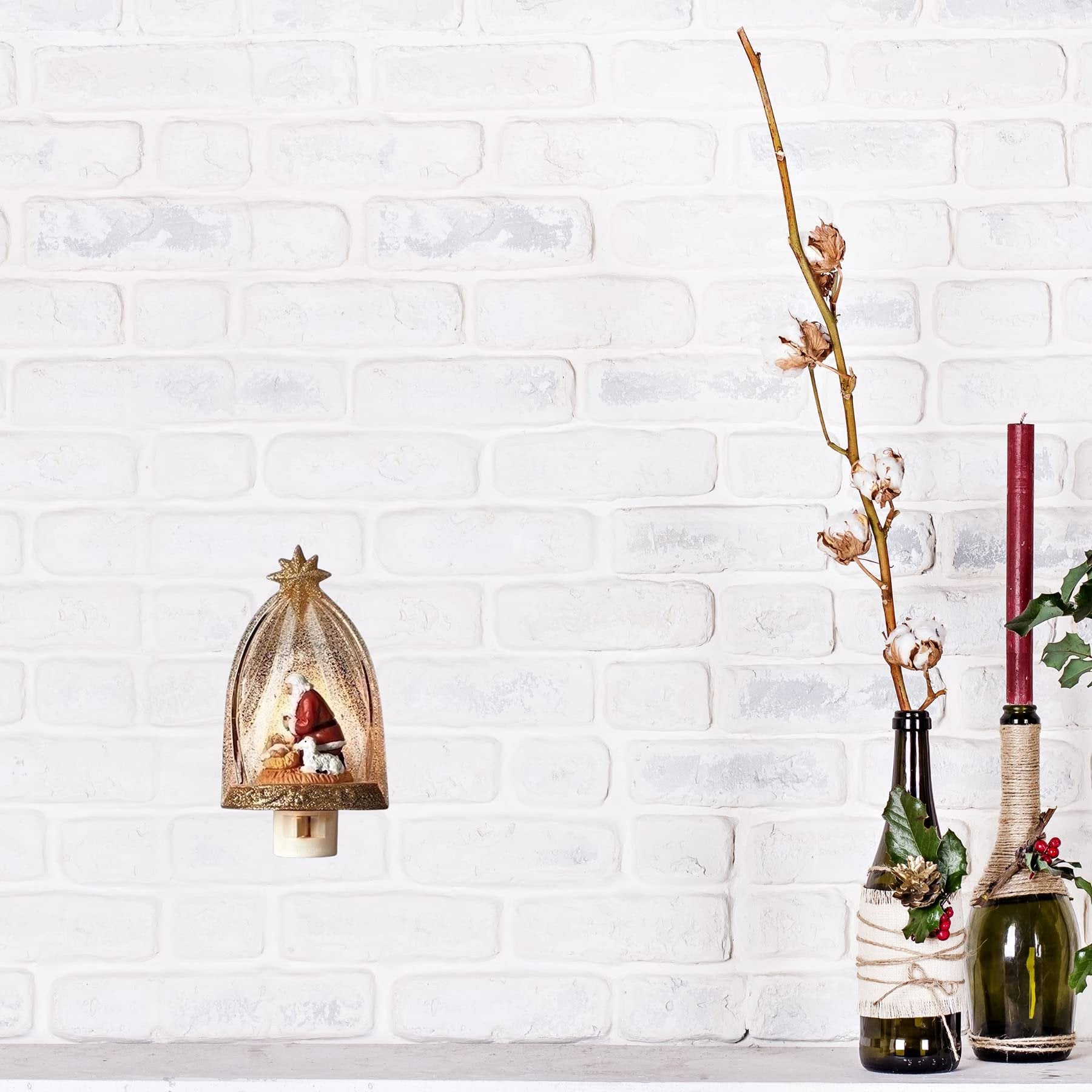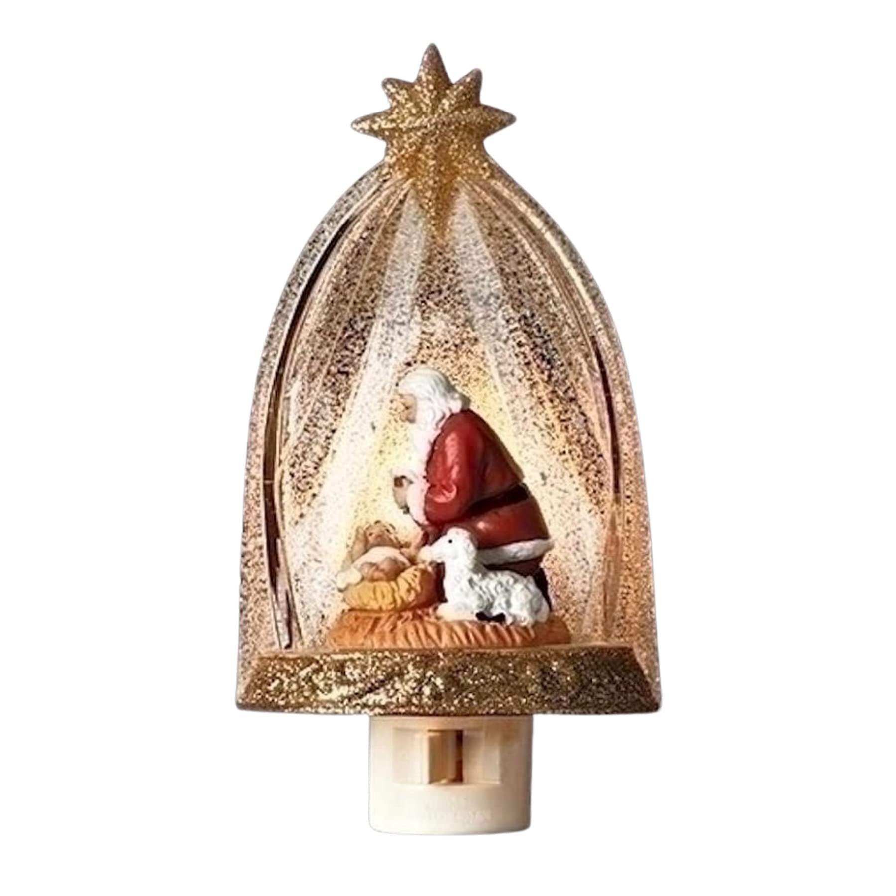 Roman Santa Claus Kneeling Before Baby Jesus in Manger Night Light