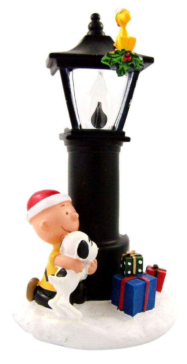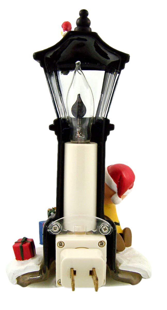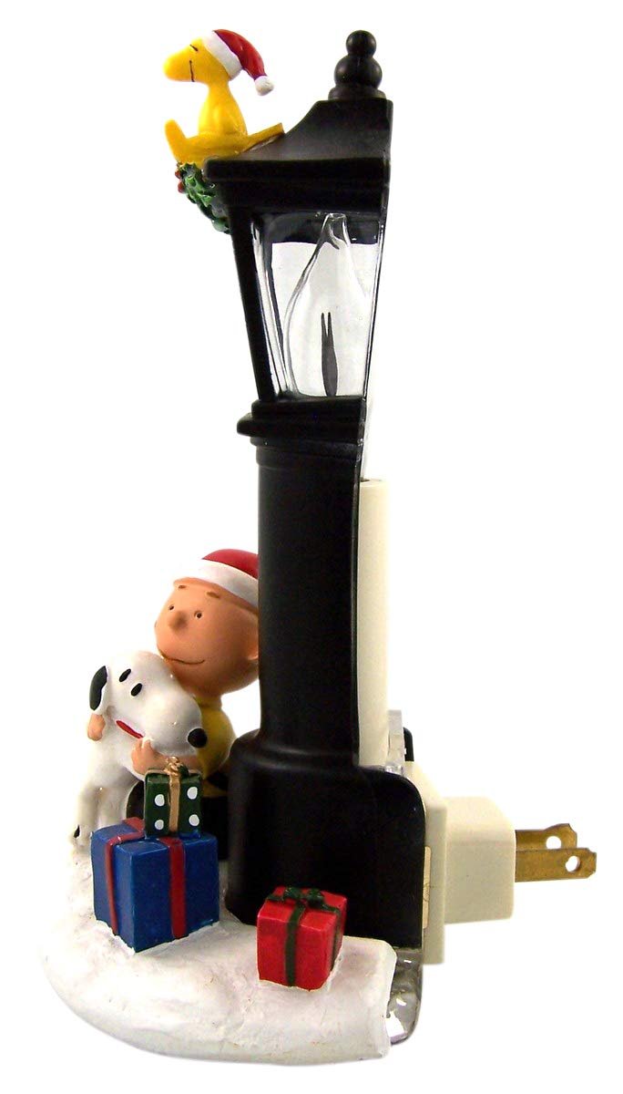 Roman Charlie Snoopy by Lamp Post Flicker Plug In Night Light features these classic cartoon and comic characters by a lamp post on a wintry night with gifts and a bird friend.Material: ResinPlug in functionBrand New in Original Packaging