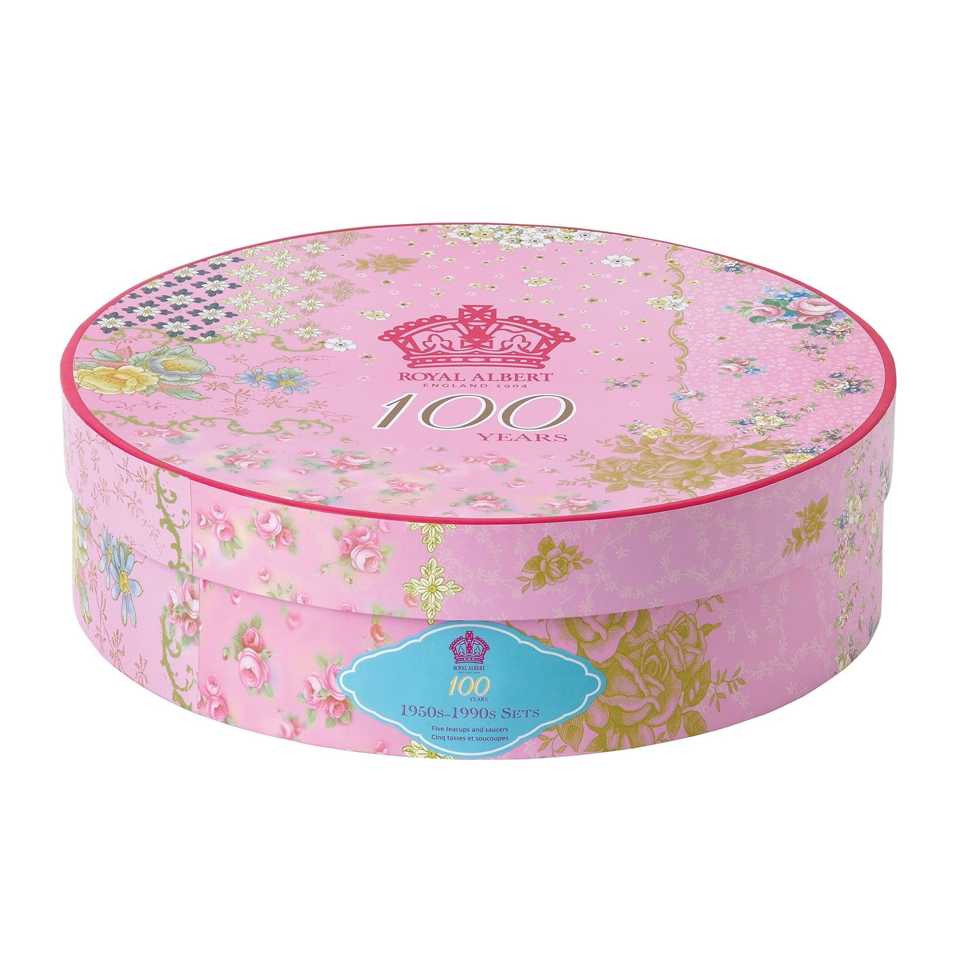 Royal Albert 100 Years 1950-1990 5-Piece Teacup & Saucer SetPart of the 100 years of Royal Albert Collection. The collection was introduced in 2006 to celebrate Royal Albert's 100th Anniversary. Royal Albert's 100 Years collection brings together a wonderful assortment of beautiful patterns drawing on Royal Albert’s 100 Year old tradition of floral designs created to reflect the fashion of each decade. Each design is a classic design of the period incorporating different patterns and gold accents to create a sumptuous design. Complete the set or mix andThis set of 5 Teacups and Saucers include Royal Albert’s famous patterns from 1950 Festival, 1960 Golden Rose, 1970 Poppy, 1980 Rose Blush and 1990 Bouquet, each design is a classic design of the periodBone china looks fantastic and provides superior strength, with elegant gold banding for that special touchPackaged in a beautiful Royal Albert presentation boxHand wash recommended. Not for use in Microwave