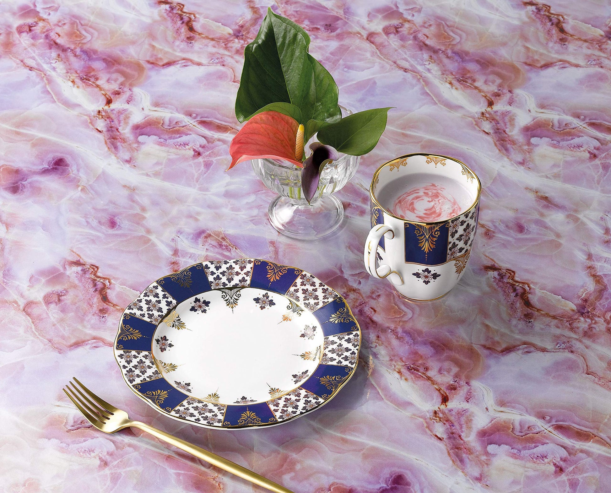 The 1900 Regency blue 3-piece set features a dessert plate teacup and tea saucer decorated in regal blue with delicate stylised Maroon floral themes and delicate gold accents
