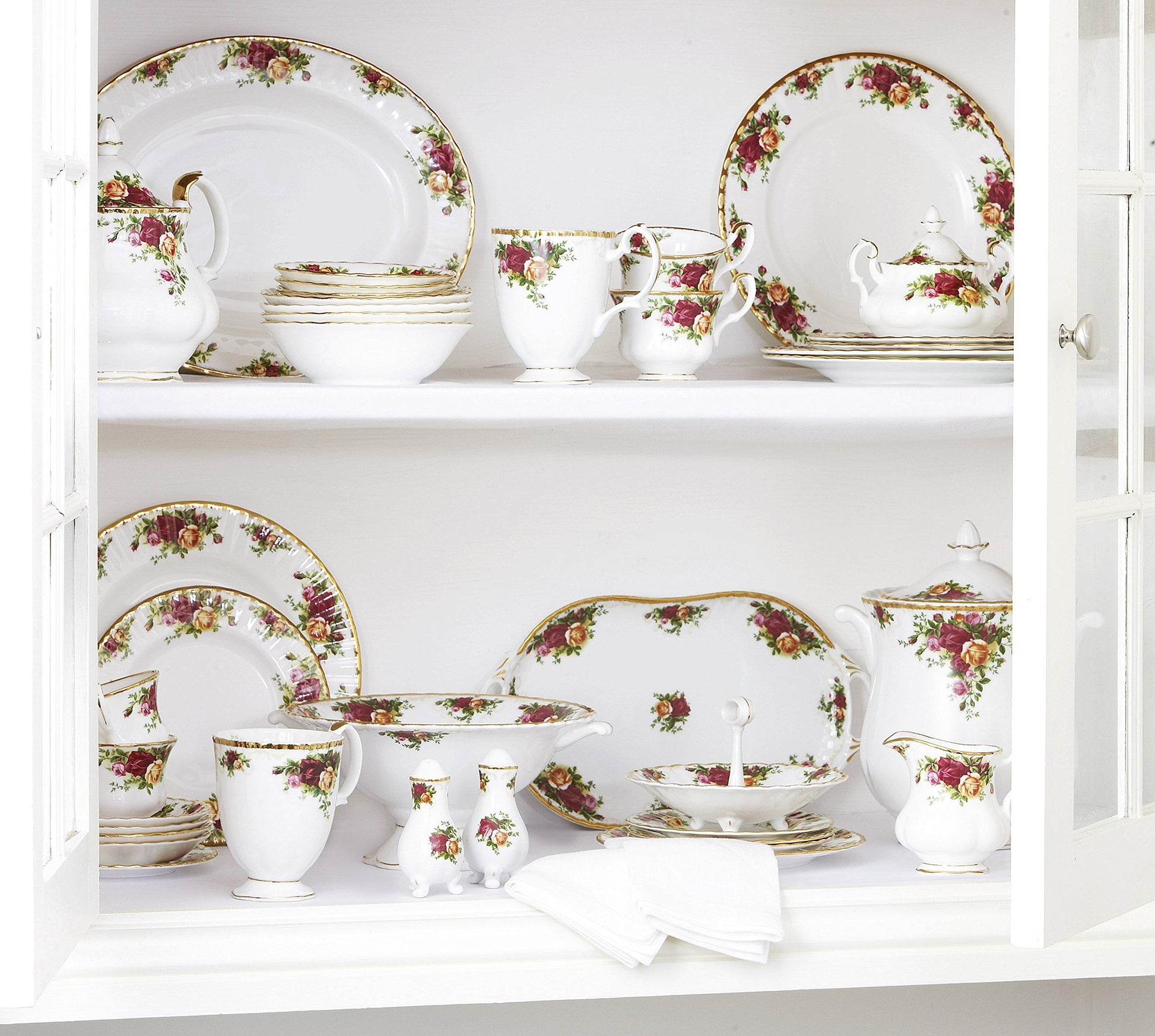 Pristine white bone china with vivid glazes and 22-carat gold trim.