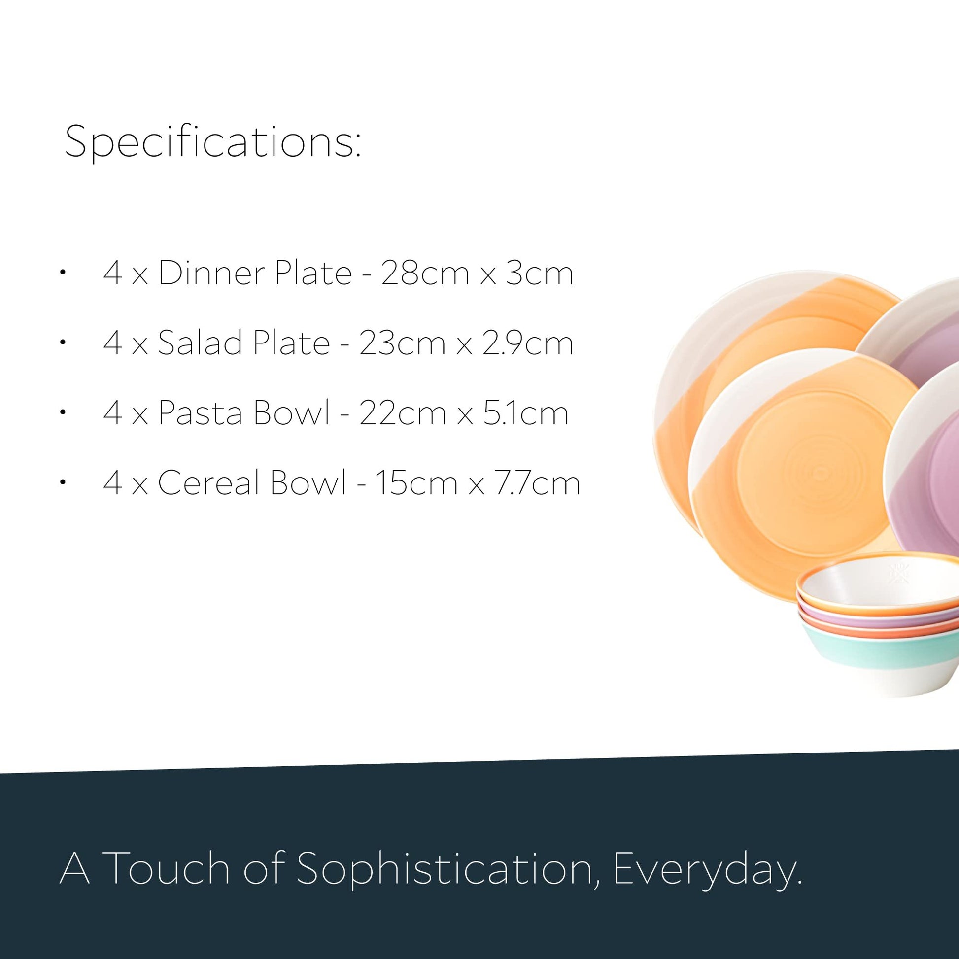 Dinner Set includes 4 each: Dinner Plates, Salad Plates; Cereal Bowls and Mugs, in 4 Bright colors