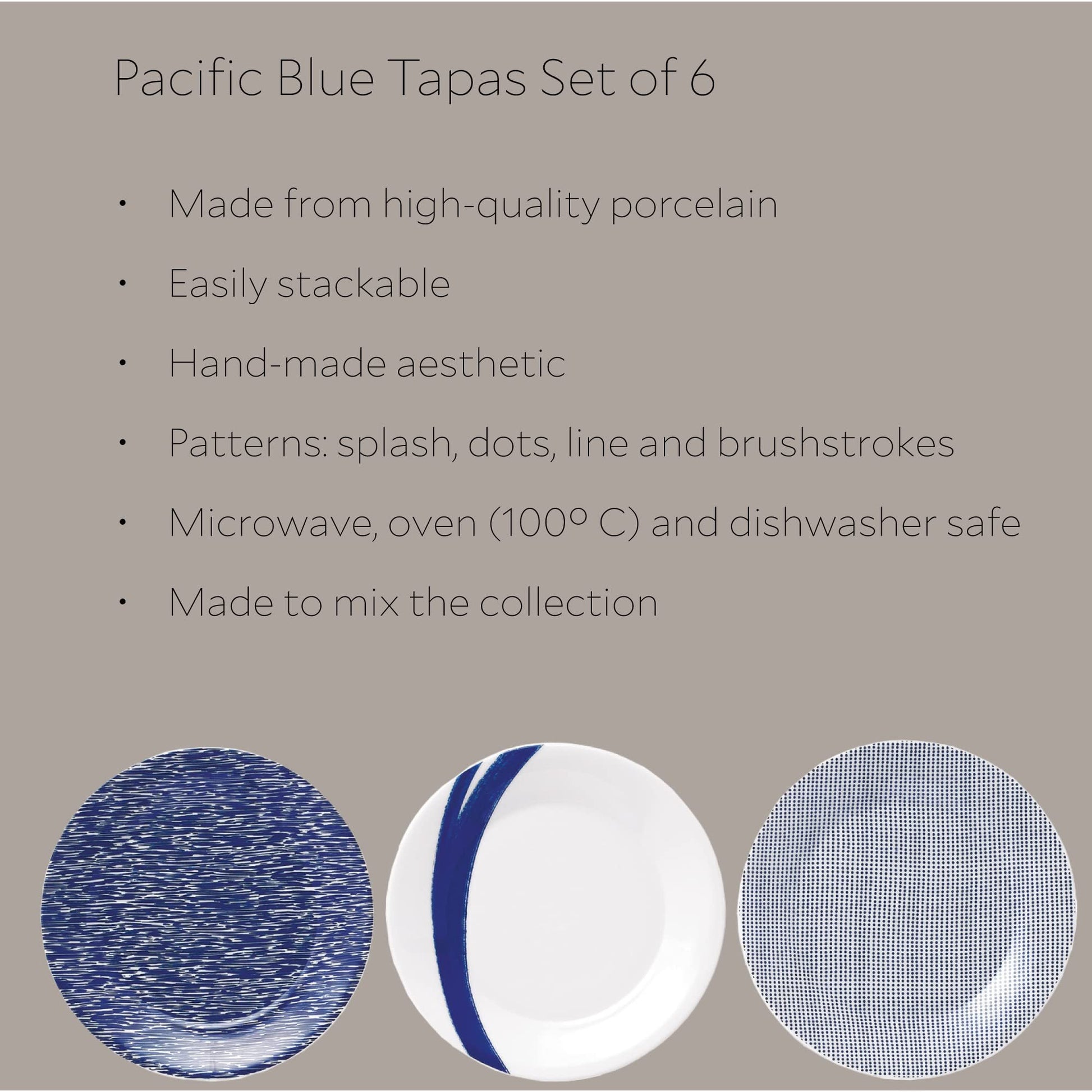 Royal Doulton Pacific Mixed Patterns Tapas Plates Set of 6, Blue/White, 6.3"Part of the Pacific Collection by Royal Doulton. Complete the set, or combine with other Royal Doulton Collections for a unique lookInspired by the sea, the Pacific collection offers an array of patterns to bring the character of the coast to your home. Dots, Stripes and Mixed Patterns in a consistent color palette of Blue/White can stand alone, or mix and match for that coastal feel. Perfect for casual dining and entertaining.Mixed Patterns Tapas Plates include 6 unique designsCrafted of high-quality Porcelain.Dishwasher, microwave and oven safe up to 100° C/212° F.Dishwasher, microwave and oven safe up to 100° C/212° F.Mix and match the 4 distinctive prints in the Pacific pattern for a colorful, contemporary look