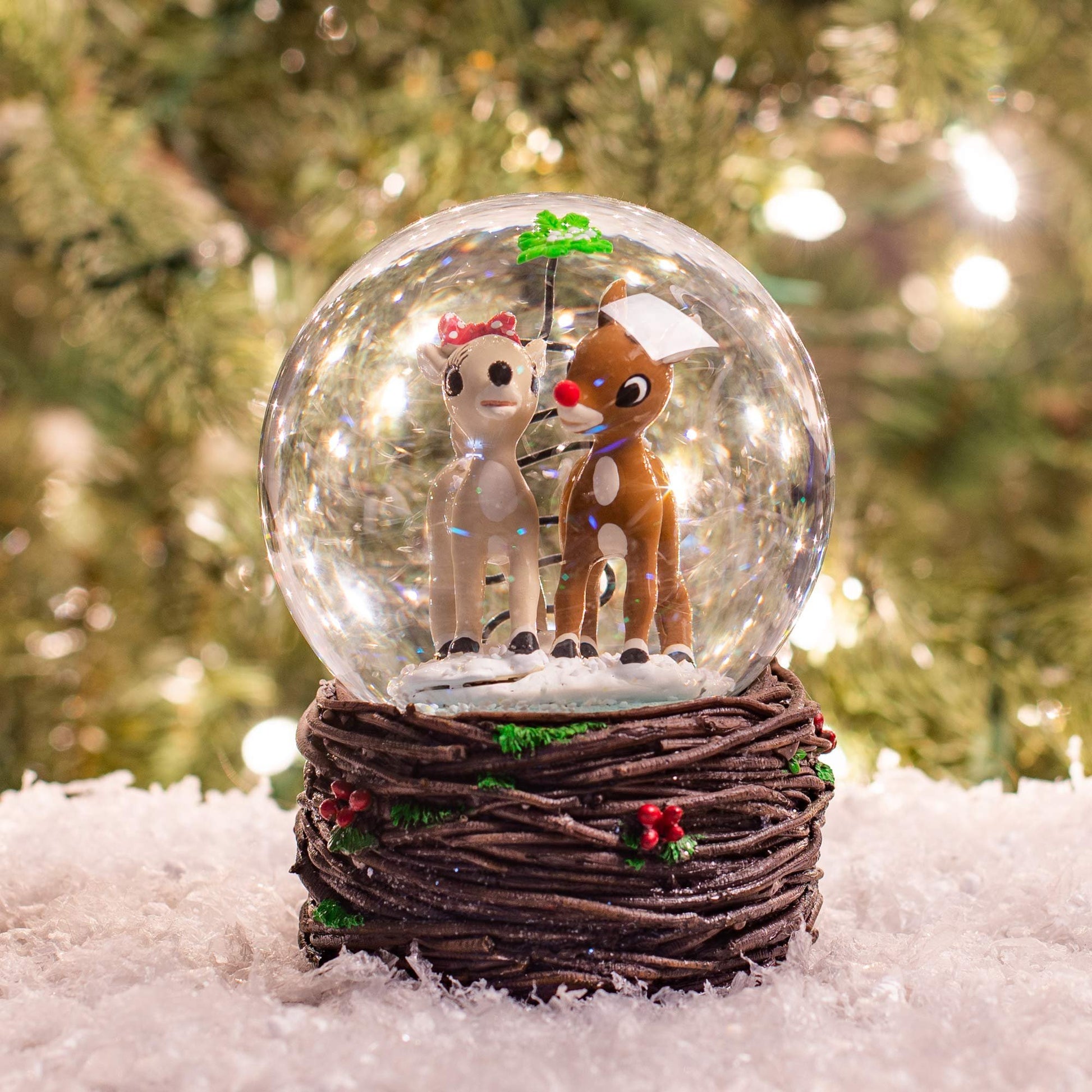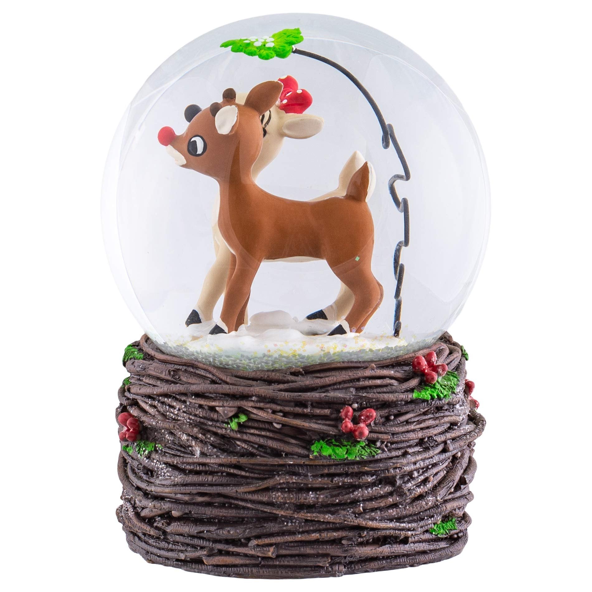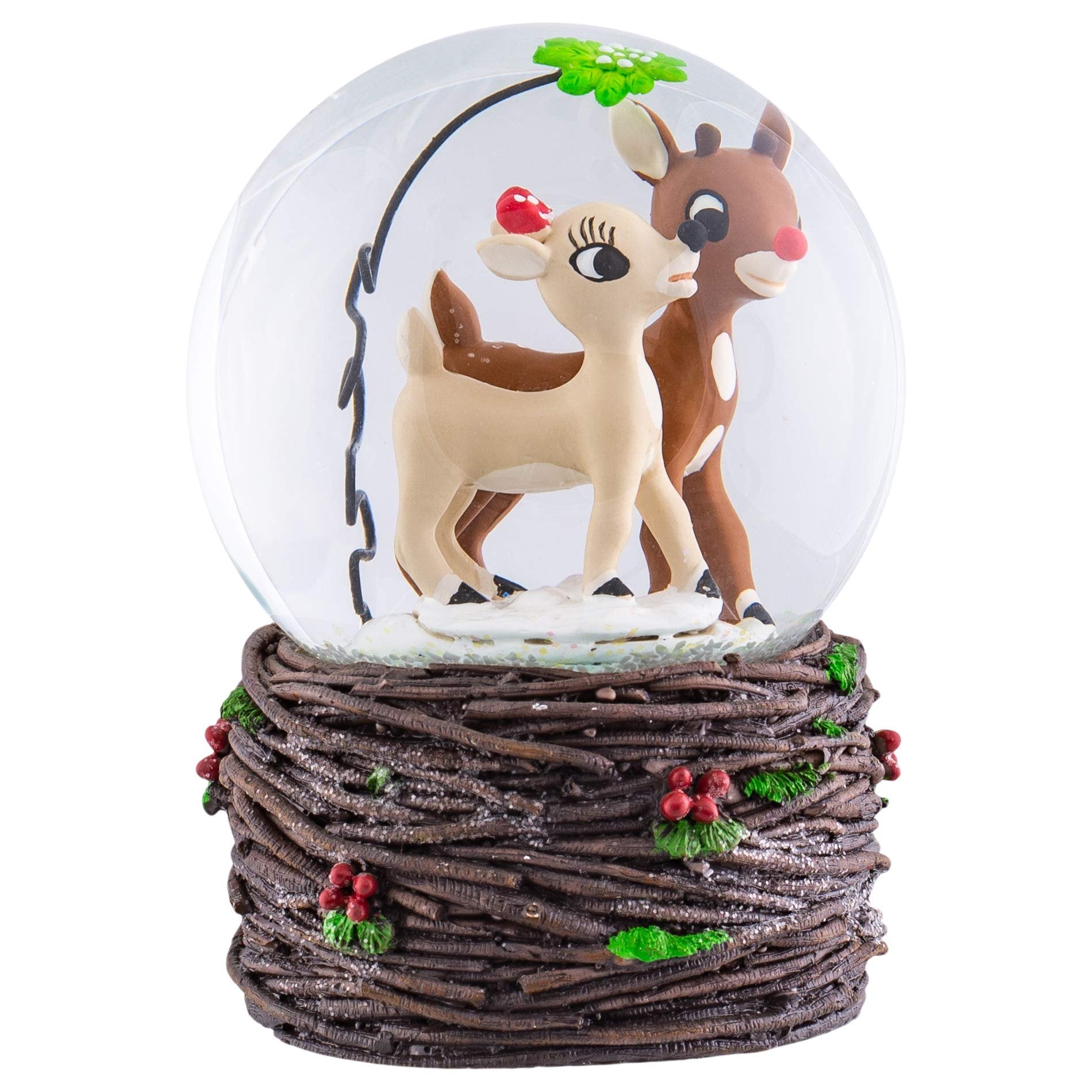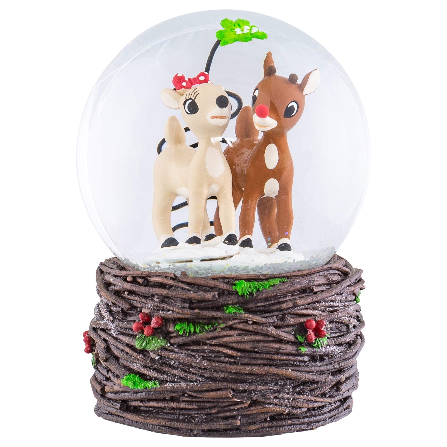 Rudolph and Clarice under Mistletoe Windup SnowdomeMaterial: Resin, Glass, Water, MetalMusical Tune: Rudolph the Red Nosed ReindeerMeasurements: 5.5in H x 3.5in W x 3.5in DMade by Roman IncRudolph and Clarice snow globe features the classic couple from the 1964 film walking together through the snow on a uniquely carved woodlike base with holly berries and leaves nestled throughoutRudolph globe is made of durable resin with Holiday forest finished baseCollectible snow globe figureine measures approximately 5.5 x 3.5 x 3.5 inchesPerfect for display on a tabletop or as part of a shelf arrangementShips in protective packaging ready for easy gifting and off-season storage