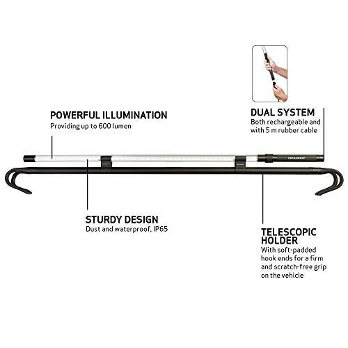 LINE LIGHT BONNET C+R provides a powerful illumination, which makes it the perfect choice for e.g. car repairs, as the light gives the optimal lighting when doing repairs in the engine compartment or inside the cabin. Yet the applications are endless. By means of a built-in prism, LINE LIGHT BONNET C+R concentrates the light in a 75° beam angle providing an extremely bright and powerful illumination of the specific working area. Blinding during work is avoided, and the lamp itself can be turned to provide the optimum lighting angle. The lamp is dust- and waterproof which means it can be used in rough, wet and demanding working environments. The lamp has a 4-hour charging time and an operating time of up to 3 hours. LINE LIGHT BONNET C+R has 2 light settings (50% or 100%) which enables you to adjust the lighting to the specific job. The telescopic holder is equipped with soft-padded hook ends to secure a firm and scratch-free grip on the vehicle.Provides 75% more luminescence compared to a traditional fluorescent bonnet lightSupplied with adjustable 47-67 inches telescopic holder with soft-padded hook ends to provide a firm and scratch-free grip on the vehicleRechargeable with up to 3 hours operating time2 light settings (50% or 100%) enabling you to adjust the light to the specific work taskDust- and waterproof (IP65) to resist even the most demanding working environment