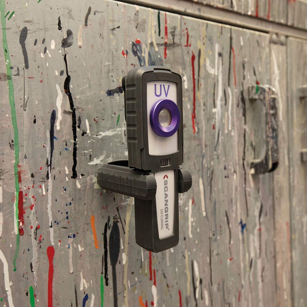 SCANGRIP UV-Light, Rechargeable LED UV Curing Light for Small and Medium Areas, Belt Clip, Sturdy Hook, Built-in Magnet, can be Used on Plastic and Heat Sensitive MaterialRechargeable LED hand-held work light for flexible and efficient UV curingTurnable sturdy hook and strong built-in magnet for flexible positioningDuring the curing, no heat is produced on the panel or the paint making it usable on plastic and other sensitive materialsSupplied with an intelligent battery indicator keeping you informed about the battery levelErgonomic design providing a comfortable grip