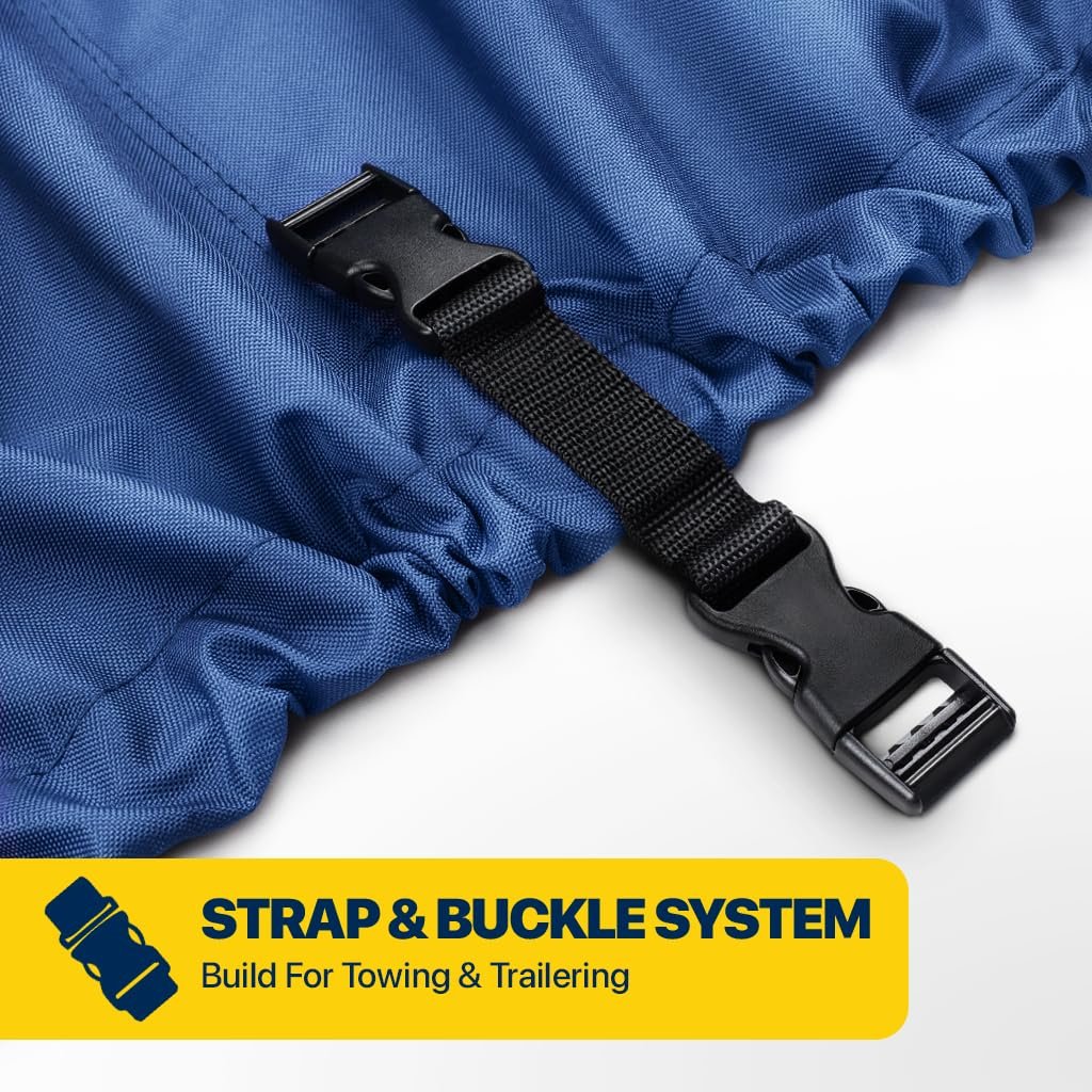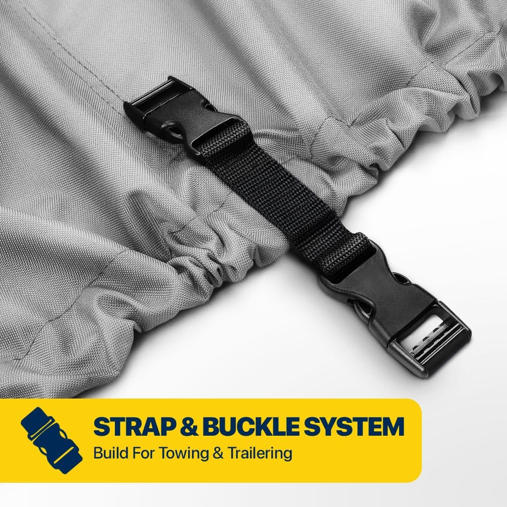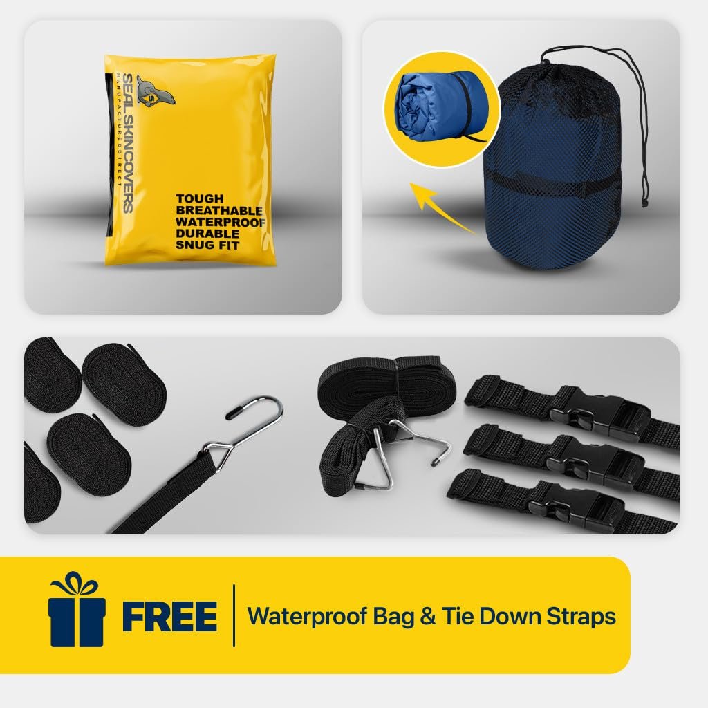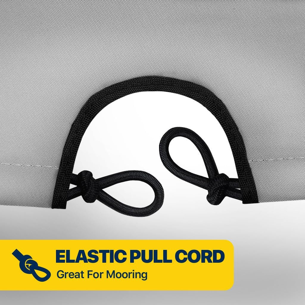 Made from heavy duty marine grade 600 denier polyester, the Seal Skin 600 provides an excellent defense against mother nature's harsh elements. It's waterproof, durable and protects against rain, UV, snow & hail. Elastic hem around the parameter and heavy duty strap and buckle system gives a secure and snug fit. This all purpose cover is perfect for trailering, mooring or storage. Double stitched taped seams prevent leaks. Easy to install and extra roomy to allow room for accessories such as spotlights, seats and boarding ladders. We also stand by our products and provide a 2 Year warranty that covers rips and tears.𝗦𝗡𝗨𝗚 𝗙𝗜𝗧: Elastic hem and adjustable straps with durable buckles provide a snug, wind-resistant fit that keeps the cover securely in place during transport and storage.𝗪𝗔𝗧𝗘𝗥𝗣𝗥𝗢𝗢𝗙: Marine-grade polyester with double-stitched, taped seams ensures complete waterproof protection, shielding your boat from rain, snow & saltwater.𝗪𝗔𝗥𝗥𝗔𝗡𝗧𝗬: Backed by a 1-year warranty, offering protection against defects, rips, and tears for worry-free use. If you have any questions or are not sure about the size, feel free to contact us.𝗧𝗥𝗔𝗜𝗟𝗘𝗥𝗜𝗡𝗚: Includes an installation guide, six 4-meter straps, two 0.85-meter buckles & a storage bag for hassle-free setup & transport. Make sure to dry and clean the area before storing.𝗗𝗨𝗥𝗔𝗕𝗜𝗟𝗜𝗧𝗬: Reinforced corners and high-strength fabric ensure long-lasting performance. Designed to withstand bad weather and daily wear for reliable protection.