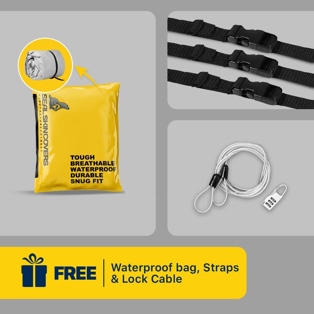 Seal Skin Covers Six-layer SUV cover offers robust protection against various weather conditions. Its heavy-duty PEVA material ensures durability and shields your vehicle against UV rays, rain, snow, and more. Made from durable and eco-friendly material, it safeguards your vehicle from scratches and damage while ensuring breathability. The Windproof straps and buckles provide secure protection, Plus, it includes free extras like a storage bag, antenna patch kit, cable lock system, extra straps and buckles. With a universal fit for SUVs, it's a comprehensive solution for keeping your vehicle clean and safe.𝗦𝗡𝗨𝗚 𝗙𝗜𝗧: Equipped with front, middle, and rear windproof straps, elastic hem, and click-tight buckles for a tight grip even in windy conditions. Reinforced grommets add theft protection.𝗪𝗔𝗧𝗘𝗥𝗣𝗥𝗢𝗢𝗙: Fully waterproof and moisture-resistant, this car cover prevents rain from seeping through. Perfect for outdoor storage, it keeps your vehicle dry and protected even during heavy rainfall.𝗪𝗔𝗥𝗥𝗔𝗡𝗧𝗬: This product comes with a 12-month full warranty, Providing reliable protection.𝗗𝗨𝗥𝗔𝗕𝗜𝗟𝗜𝗧𝗬: Crafted from high-quality PEVA material with strong stitching and reinforced seams, this car cover offers long-lasting performance. It resists wear and tear, ensuring reliable protection.𝗔𝗟𝗟-𝗪𝗘𝗔𝗧𝗛𝗘𝗥 𝗣𝗥𝗢𝗧𝗘𝗖𝗧𝗜𝗢𝗡: This car cover shields vehicle from rain, snow, UV rays, wind, hail, dust, and more.