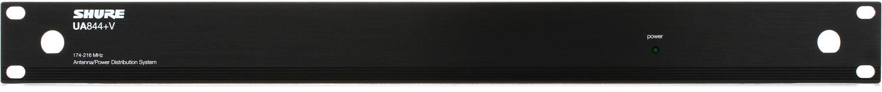 Antenna Distribution System for QLX-D and ULX-D Sweetwater recommends the Shure UA844+V/LC antenna distribution system for expanding your QLX-D or ULX-D VHF wireless microphone systems. The UA844+V/LC works by splitting one pair of antennas out to multiple receivers; it also amplifies RF signals to offset insertion loss from splitting signal power to multiple outputs. One UA844+V/LC system can support up to five wireless receivers; you can use a maximum of five UA844+V/LC systems in a 2-tiered configuration. Note: The UA844+V/LC is the VHF version. The UHF version is available here. Please contact your Sweetwater Sales Engineer if you have any questions.Shure UA844+V Features: 5-way RF signal output Compatibility: VHF QLX-D and ULX-D receivers Front-mount antenna hardware Includes rackmount hardware 4 DC power feeds — 15V, 2.5A maximum Antenna-bias DC outputs — 12V, 300mA maximum 1 UA844+ antenna/power distribution system 1 PS45 power supply 2 bulkhead adapters 1 rackmount hardware kit