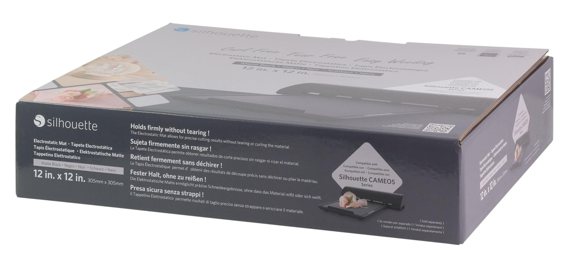 Silhouette Electrostatic Cutting Mat for use with Cameo 5 and Cameo 5 Plus models - 12 x 12 (Matte Black)The Electrostatic Mat attachment for the Cameo 5 makes loading and unloading materials cleaner and easier than ever before. It gives firmer holds to your delicate materials* without damaging them while removing them from the mat.The Electrostatic Mat has an electrically conductive network that builds up static electricity to hold materials in place during cutting. Because the material can be held without an adhesive mat, it is now possible to cut materials without damaging them upon removal. Additionally, when unloading the cut project, there is no tearing or curling, and clean-up is a breeze.The Electrostatic Mat works best with smooth, non-permeable materials. Materials with a heavy texture will not work with the Electrostatic Mat.Only compatible with the Cameo 5 models: CAMEO 5 and CAMEO 5 PLUS