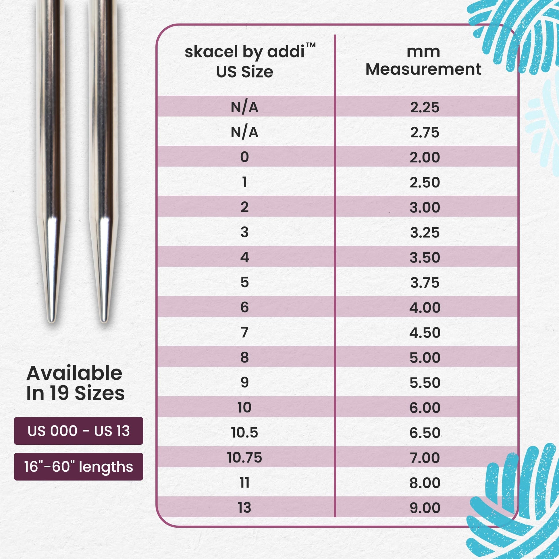 Craft intricate patterns effortlessly with skacel by addi Rocket Circular Knitting Needles! Featuring a durable brass construction, our metal knitting needles for adults are built to last, offering reliable performance over several projects and protecting against wear and tear while maintaining a polished finish. Great for both beginning hobbyists and seasoned knitters, our needle sets feature sharp tips ideal for precision knitting, making them great for fine textiles and intricate lacework. Our knitting tools allow for seamless transitions between yarns to offer a snag-free experience, enhancing your efficiency and creativity. The pliable nylon cord of our knitting supplies offers flexibility to ensure your knitting flow remains uninterrupted and reduce wrist strain during long projects. Featuring a perfect blend of craftsmanship and functionality, our knitting in the round needles are a must-have addition to any knitter's toolkit. Explore endless possibilities with our versatile circular knitting sticks set and elevate your knitting projects to new heights!CIRCULAR KNIT NEEDLES: Enhance your creativity and efficiency skacel by addi Rocket Knitting Needles! Our round brass knitting needles allow you to craft intricate patterns effortlessly, and are paired with a durable nylon cord to ensure your knitting flow remains uninterrupted, reducing wrist strain during long projectsPRECISION PERFECT FOR DELICATE CREATIONS: Our single point knitting needles feature sharp tips designed for precision knitting, making them ideal for intricate lacework and fine textiles; our circle knitting needles allow your creativity to shine through refined and detailed projects while enhancing your technical skillsSMOOTH TRANSITIONS: Our knitting needles for adults offer smooth joins between yarns to ensure a snag-free experience; the premium quality pliable blue nylon cord provides flexibility, allowing you to easily maneuver through complex patternsDURABLE CONSTRUCTION: Featuring a strong and sturdy brass construction, our yarn needles are built to last, protecting against wear and tear while maintaining a polished finish. Suitable for both beginners and seasoned knitters, offering reliable performance over countless projectsGREAT GIFT FOR KNITTING ENTHUSIASTS: Our knitting needles set is perfect for inspiring creativity in fellow crafters, make for a great gift for hobbyists and professional knitters alike, and an excellent and practical addition to any knitting kit