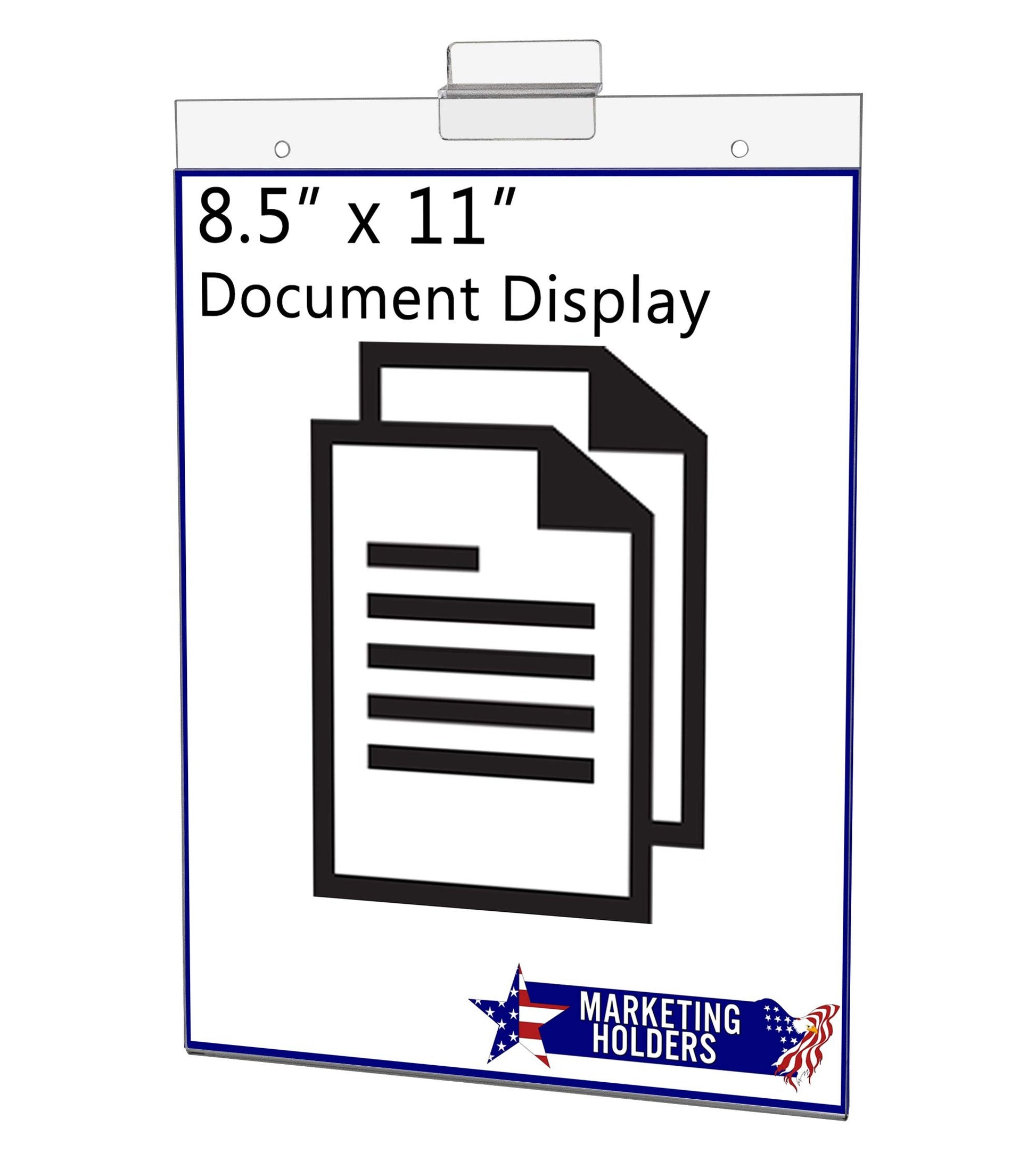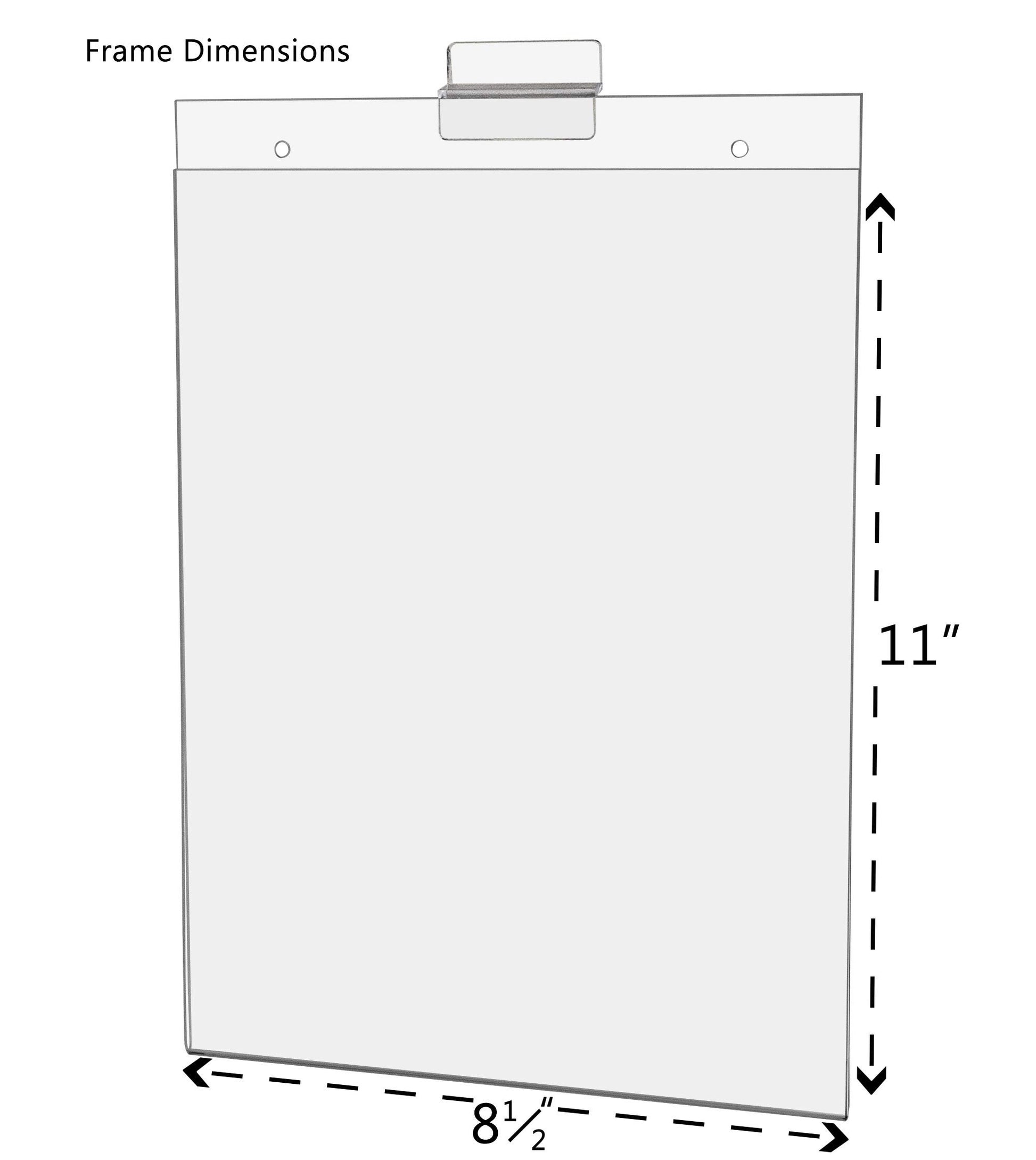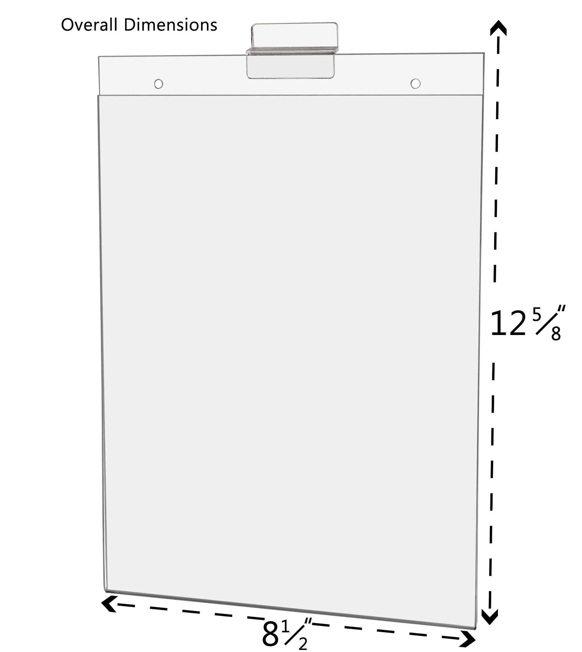 8.5"W x 11"H Slatwall Sign Holder for Pricing Sales and Specials Product Features: Holds 8.5"W x 11"H literature Overall Dimensions: 8.5"W x 12.5"H Thickness: 0.080, 5/64", 2MM Perfect hanging display solution for advertisements, notices, flyers and hours of operation in restaurants, bars, retail stores, hotels and other business locations Top or side loading design makes sign changes quick and easy These slatwall sign sleeves are designed for standard slatwalls. Will not fit on custom or metal slatwalls. Proudly made with premium high quality materials Tired of walking into professional businesses or stores and seeing paper signs taped to the wall? This slatwall sign sleeve is perfect for displaying advertising, graphic images, printed media or to showcase documents that you would like to have on display in your retail shop, trade show booth or office. Use these holders to inform your customers or clients about advertisements or general informational notices. These are lightweight and durable which means they can be placed on most standard slotwalls in any business, hotels, offices or facilities. These slatwall sign accessories can be used practically anywhere, from trade shows to bookstores and galleries. They are easy to use, simply slide your paper sign or any other printed literature anywhere you want the general public and or office staff to see them. Our products can be and have been purchased for businesses like offices, retail stores, shopping centers, malls, gas stations, automotive and tire shops, candy shops, toy and video game stores, salons, storage facilities, clinics, schools, government buildings and welcome centers. These slatwall organizers ship preassembled. No assembly required! *All sizes are approximate *These slatwall literature holders are designed for standard slatwalls. Will not fit on custom or metal slatwalls.Top or side loading slatwall sign holder for 8.5"W x 11"H literature.Overall Dimensions: 8.5"W x 12.5"H. Thickness: 0.080, 5/64", 2MM. *All sizes are approximate.Perfect hanging display solution for advertisements, notices, flyers and hours of operation in restaurants, bars, retail stores, hotels and other business locations. Top or side loading design makes sign changes quick and easy. These slatwall sign sleeves are designed for standard slatwalls. Will not fit on custom or metal slatwalls. Proudly made with premium high quality materialsTired of walking into professional businesses or stores and seeing paper signs taped to the wall? This slatwall sign sleeve is perfect for displaying advertising, graphic images, printed media or to showcase documents that you would like to have on display in your retail shop, trade show booth or office. Use these holders to inform your customers or clients about advertisements or general informational notices.These are lightweight and durable which means they can be placed on most standard slotwalls in any business, hotels, offices or facilities. These slatwall sign accessories can be used practically anywhere, from trade shows to bookstores and galleries. They are easy to use, simply slide your paper sign or any other printed literature anywhere you want the general public and or office staff to see them.Our products can be and have been purchased for businesses like offices, retail stores, shopping centers, malls, gas stations, automotive and tire shops, candy shops, toy and video game stores, salons, storage facilities, clinics, schools, government buildings and welcome centers. These slatwall organizers ship preassembled. No assembly required! *All sizes are approximate *These slatwall literature holders are designed for standard slatwalls. Will not fit on custom or metal slatwalls.