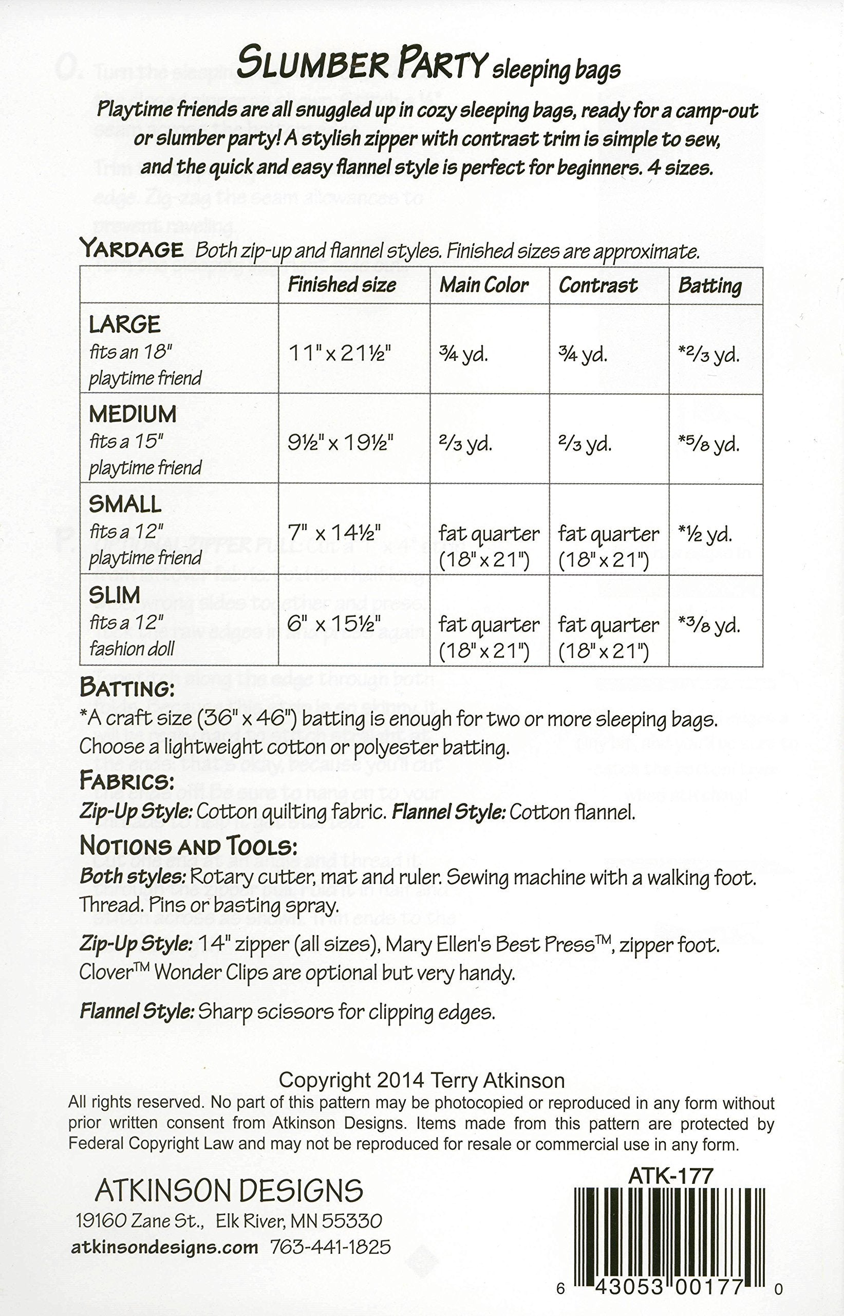 Playtime friends are all snuggled up in cozy sleeping bags, ready for a camp-out or slumber party! A stylish zipper with contrast trim is simple to sew, and the quick and easy flannel style is perfect for beginners. Comes in 4 sizes: Large: Fits a 18 inch size doll Medium: Fits a 15 inch size doll Small: Fits a 12 inch size doll Slim: Fits a 12 inch fashion doll