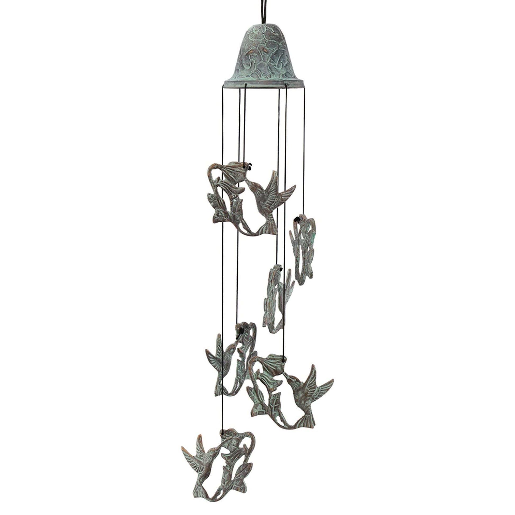 Beautifully crafted brass wind chime featuring hummingbirds in mid-flight feeding on flowers. Verdigris finish adds a weathered and vintage touch. A wonderful piece for indoor and/or covered outdoor spaces. Measures approximately 14” H. x 3” W. x 3” D. Made of brass. Made in India.Beautifully crafted wind chime featuring hummingbirds in mid-flight feeding on flowersVerdigris finish adds a weathered and vintage touchA wonderful piece for indoor and/or covered outdoor spacesMeasures approximately 14” H. x 3” W. x 3” D.Made of brass