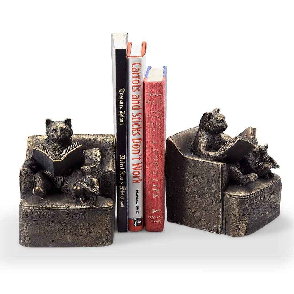 A canny kitty and his mouse pal sit together and enjoy a story - a shining example of friendship. Polystone resin with weathered bronze finish. Pair.6"H 4.5"W 4.5"DPolystone ConstructionWeathered Bronze FinishPerfect for the Office, Library, Classroom or BookshelfJust under a weighty 9 pounds
