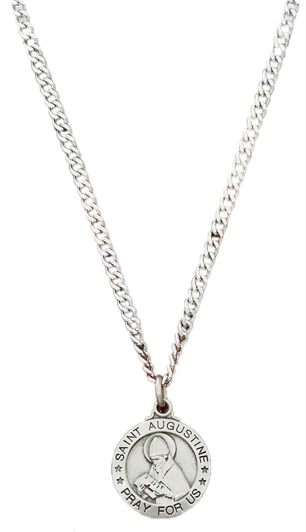 Proudly manufactured in the USA3/4" Pewter Saint Augustine Medal24-inch Nickel Plate ChainLaminated Holy Card
