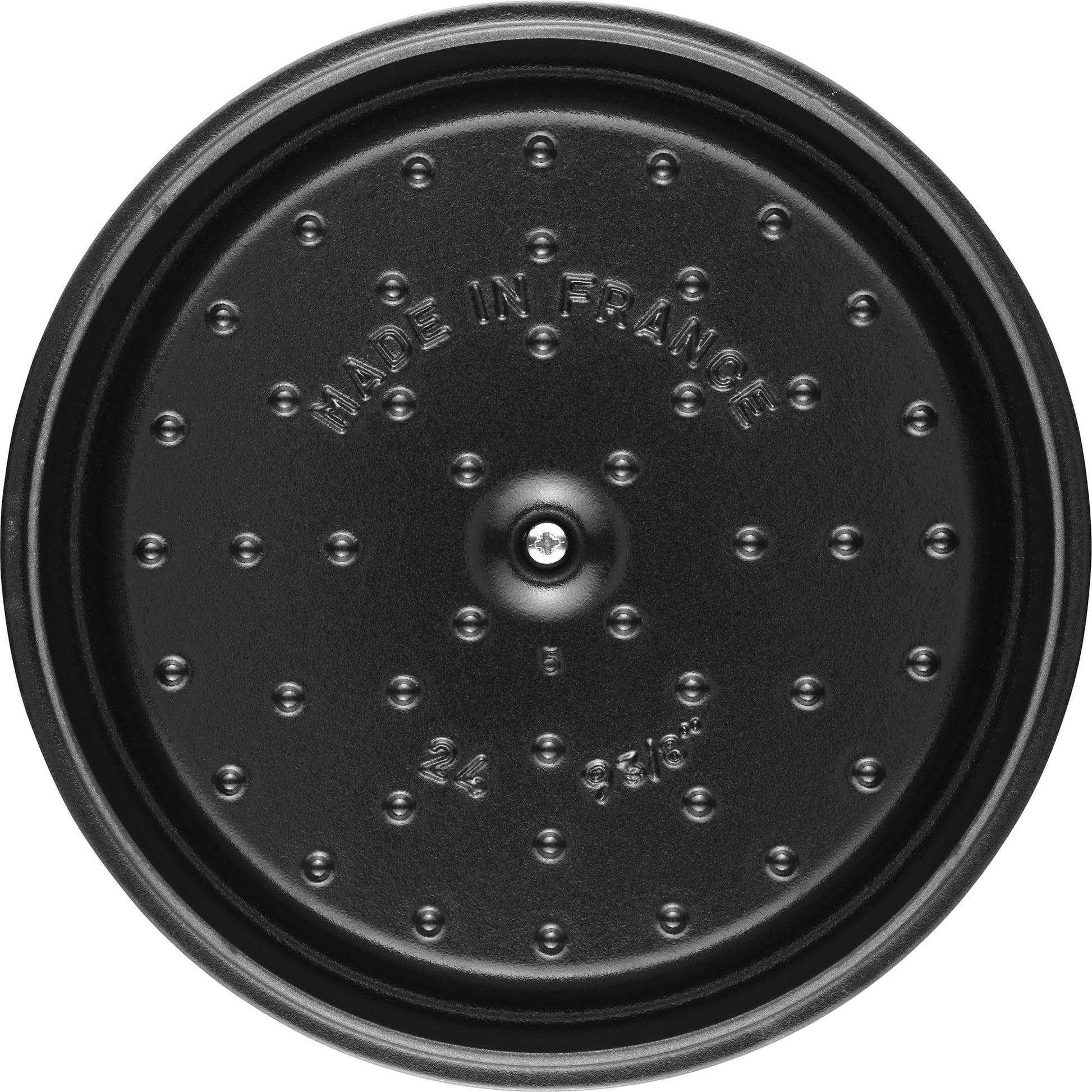 The Staub cocotte is unsurpassed for slow-cooking meats and vegetables to tender perfection, and for simmering hearty stews and soups. Cast iron possesses exceptional heat-retaining qualities, so the pot heats evenly throughout. The innovative lid features tiny spikes on the interior that continually release condensed liquid back onto the food, yielding moist, flavorful results.Staub's special matte black enamel interior and self-basting spiked lid guarantee perfect browning and braising for flavor-enhanced food. With their exquisite enamel finish, each piece transitions beautifully from the kitchen to the table. From comfort food to sumptuous suppers, every dish is special when served in Staub.Staub enameled cast iron cookware is the choice of the world's best chefs. With exceptional durability, it is perfect for day-to-day use in both gourmet home kitchens and prestigious restaurants around the world. Built to last a lifetime, these heirloom pieces can be passed from generation to generation.4-quart cocotte for soups, stews, and braises.Textured black matte enamel interior requires no seasoning and ensures exceptional browning, and heat retention and distributionSmooth enamel bottom works on all stovetops, including inductionHeavy weight, tight-fitting lid retains moisture, spikes on the lid create a rain-forest effect evenly returning juices back onto foodOven safe up to 500°FUnique, interior matte texture results in exceptional browningDishwasher safe, hand wash recommended