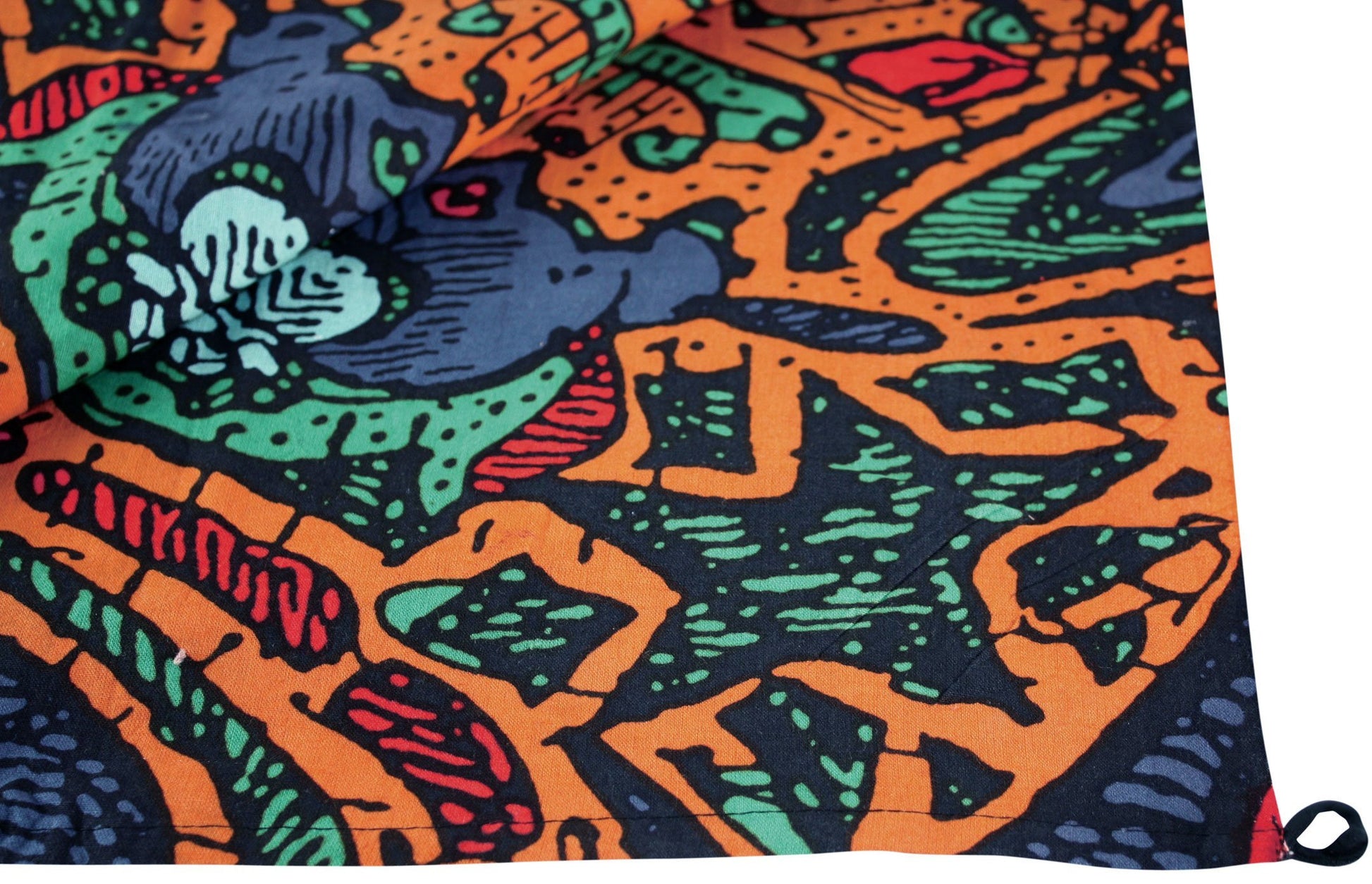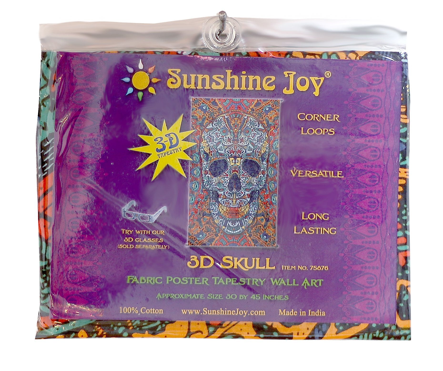 Sunshine Joy 3D Skull Tapestry - Artwork by Chris Pinkerton -- Sunshine Joy’s 3-D Tapestries take beautiful, large-scale art and design into another dimension. You stare at your new Sunshine Joy tapestry intently as it hangs on your wall. You marvel at its intricate and well-crafted design and love the beauty it brings to your environment. The colors and artwork are inspiring. One would never expect anything more from this printed fabric. But then, you break out Sunshine Joy’s 3-D Glasses and WOW. You have gone deep down through the rabbit hole and into another dimension. It appears that you can get your hands behind the colors, and it’s fun watching your friends do just that. -- The designs look beautiful to the naked eye and incredible with our 3-D glasses -- In India, they are what locals use as bedcovers. People use them at home for tablecloths, bed-sheets, room dividers, curtains, window treatments, ceiling decor and to quickly cover up. - The corner loops make our tapestries the perfect multipurpose outdoor traveling companion. Secure your picnic sheet . At festivals, stake out an appropriate amount of space for your friends. Tie up a sunscreen at the campsite. Great at the beach as a windproof beach sheet or sun cover-up. 100% Cotton. Our tapestries are printed, not quilted or woven. They are hippie Indian tapestries. Thin as sheet. Good, tight power loom construction. Hemmed edges. The printing process is unique to India. Each tapestry has its unique imperfections. Sunshine Joy's tapestries are printed with a special soft fiber reactive dye. This is the same soft feeling of your favorite tie-dyed T-shirt. Some colors may show through the back side to give the impression that they are double sided with one side lighter than the other. Actually, they are only printed on one side. -- Size is approximately 5 feet by 7.5 feet. 60 inches by 90 inches 152 centimeters by 228 centimeters 1.52 meters by 2.28 meters. Fits a twin XL college dorm bed.3D reactive artwork - Amazing visual effects when viewed through 3-D glassesMeasures approximately 60 by 90 inches.Equipped with sturdy corner loops for easy hanging, tying & beach stakingHand crafted in India using traditional methodsArt by Chris Pinkerton