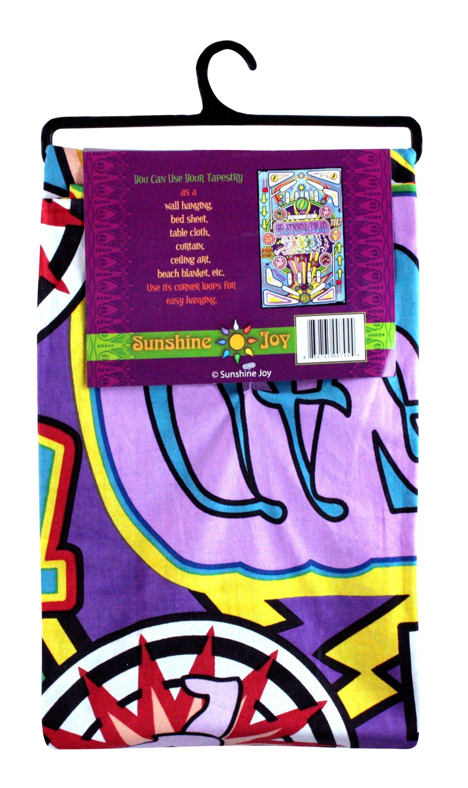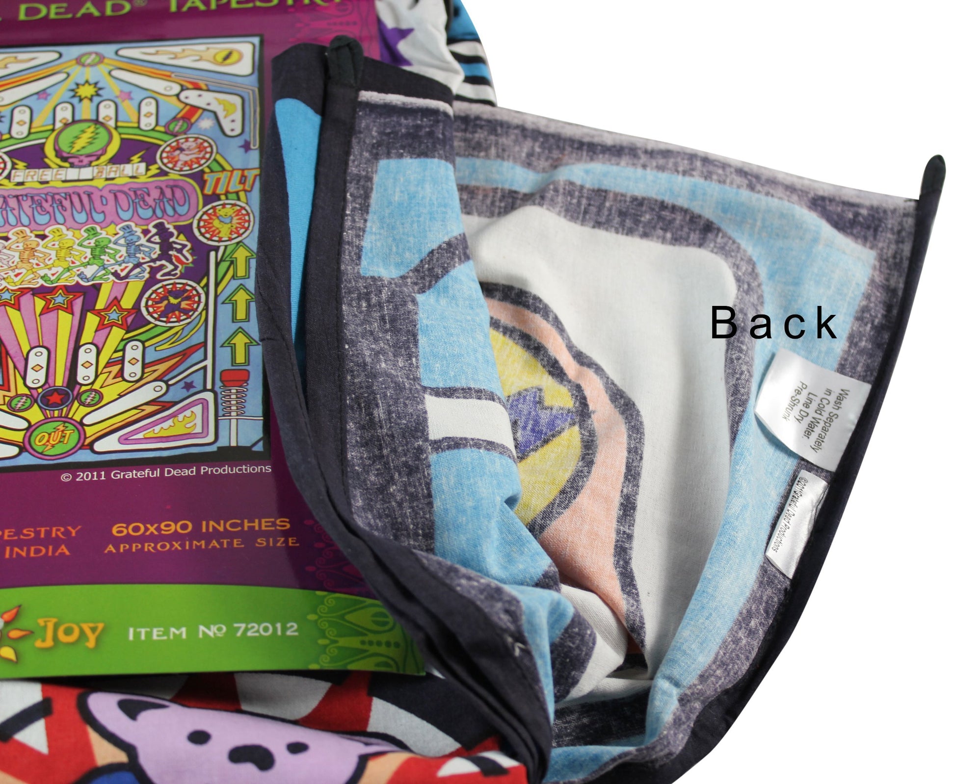 Sunshine Joy is an official Grateful Dead partner. TM & Grateful Dead Productions. All Rights Reserved. --- 3D Pinball Machine Tapestry -- Sunshine Joy’s 3-D Tapestries look beautiful to the naked eye and incredible with our 3-D glasses -- In India, they are what locals use as bedcovers. People use them at home for tablecloths, bed-sheets, room dividers, curtains, window treatments, ceiling decor and to quickly cover up. - The corner loops make our tapestries the perfect multipurpose outdoor traveling companion. Secure your picnic sheet . At festivals, stake out an appropriate amount of space for your friends. Tie up a sunscreen at the campsite. Great at the beach as a windproof beach sheet or sun cover-up. 100% Cotton. Our tapestries are printed, not quilted or woven. They are hippie Indian tapestries. Thin as sheet. Good, tight power loom construction. Hemmed edges. The printing process is unique to India. Each tapestry has its unique imperfections. Sunshine Joy's tapestries are printed with a special soft fiber reactive dye. This is the same soft feeling of your favorite tie-dyed T-shirt. Some colors may show through the back side to give the impression that they are double sided with one side lighter than the other. Actually, they are only printed on one side. -- Size is approximately 5 feet by 7.5 feet. 60 inches by 90 inches 152 centimeters by 228 centimeters 1.52 meters by 2.28 meters. Fits a twin XL college dorm bed.Sunshine Joy is an official Grateful Dead partner. TM & Grateful Dead Productions. All Rights Reserved.Stunning 3-D effects when viewed through 3-D glassesMeasures approx. 60 x 90 inchesEquipped with sturdy corner-loops for easy wall hanging, tying and beach stakingMakes a great wall hanging, tablecloth, beach cover up, couch cover or window curtain!