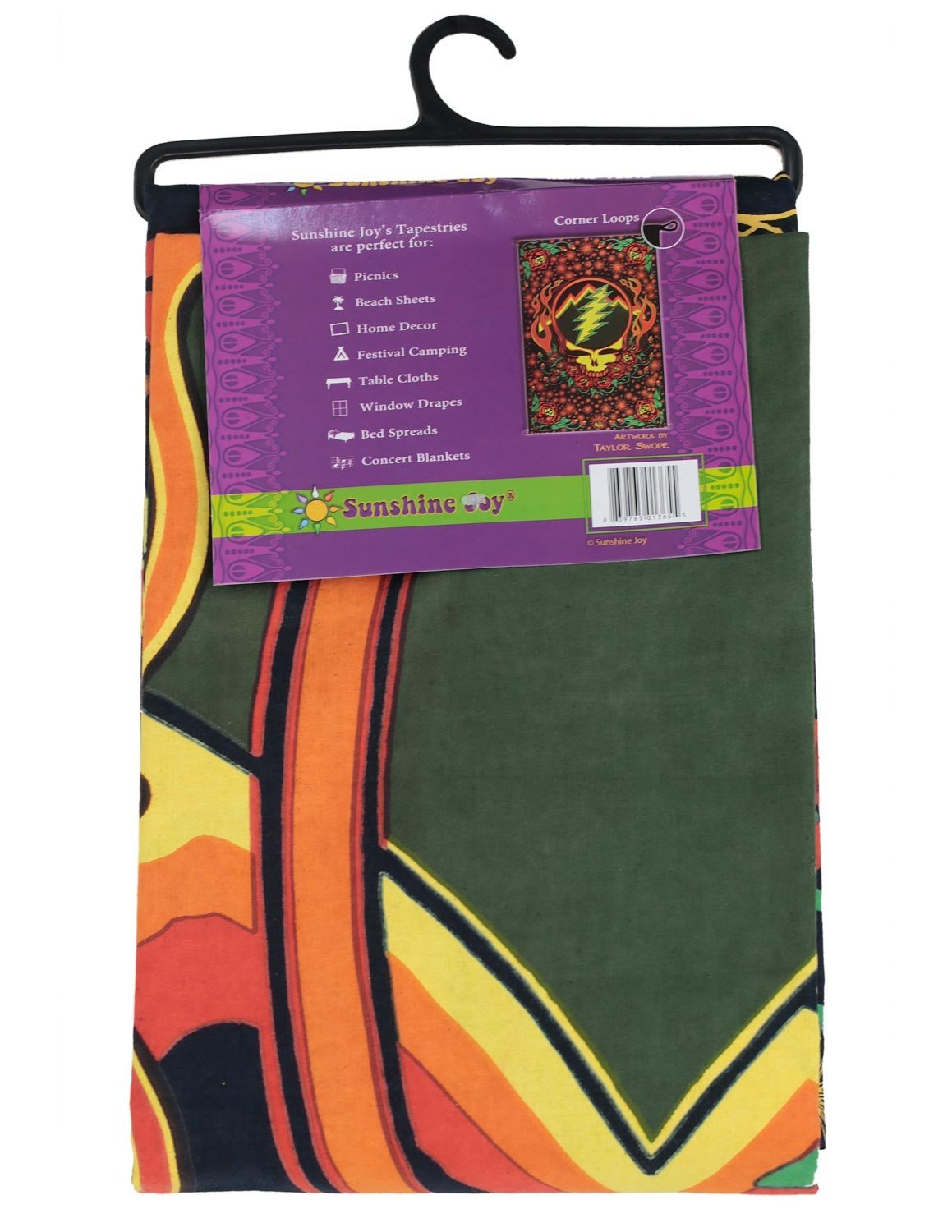 Sunshine Joy is an official Grateful Dead partner. TM & Grateful Dead Productions. All Rights Reserved. --- 3D Grateful Dead Scarlet Fire Stealie tapestry -- Sunshine Joy’s 3-D Tapestries look beautiful to the naked eye and incredible with our 3-D glasses -- In India, they are what locals use as bedcovers. People use them at home for tablecloths, bed-sheets, room dividers, curtains, window treatments, ceiling decor and to quickly cover up. - The corner loops make our tapestries the perfect multipurpose outdoor traveling companion. Secure your picnic sheet . At festivals, stake out an appropriate amount of space for your friends. Tie up a sunscreen at the campsite. Great at the beach as a windproof beach sheet or sun cover-up. 100% Cotton. Our tapestries are printed, not quilted or woven. They are hippie Indian tapestries. Thin as sheet. Good, tight power loom construction. Hemmed edges. The printing process is unique to India. Each tapestry has its unique imperfections. Sunshine Joy's tapestries are printed with a special soft fiber reactive dye. This is the same soft feeling of your favorite tie-dyed T-shirt. Some colors may show through the back side to give the impression that they are double sided with one side lighter than the other. Actually, they are only printed on one side. -- Size is approximately 5 feet by 7.5 feet. 60 inches by 90 inches 152 centimeters by 228 centimeters 1.52 meters by 2.28 meters. Fits a twin XL college dorm bed.3D Reactive Artwork - Amazing visual effects when viewed with 3D glassesEquipped with sturdy corner loops for easy hanging, tying and beach stakingSunshine Joy is an official Grateful Dead partner. TM & Grateful Dead Productions. All Rights Reserved.Measures 60x90 inchesMakes a great wall hanging, tablecloth, beach cover up, couch cover or window curtain