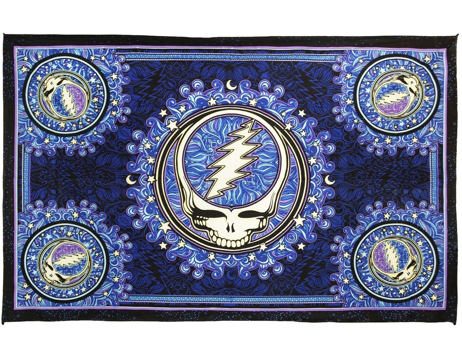 Sunshine Joy is an official Grateful Dead partner. TM & Grateful Dead Productions. All Rights Reserved. --- Grateful Dead Steal Your Face Tapestry featuring the artwork of Dan Morris-- In India, they are what locals use as bedcovers. People use them at home for tablecloths, bed-sheets, room dividers, curtains, window treatments, ceiling decor and to quickly cover up. - The corner loops make our tapestries the perfect multipurpose outdoor traveling companion. Secure your picnic sheet . At festivals, stake out an appropriate amount of space for your friends. Tie up a sunscreen at the campsite. Great at the beach as a windproof beach sheet or sun cover-up. 100% Cotton. Our tapestries are printed, not quilted or woven. They are hippie Indian tapestries. Thin as sheet. Good, tight power loom construction. Hemmed edges. The printing process is unique to India. Each tapestry has its unique imperfections. Sunshine Joy's tapestries are printed with a special soft fiber reactive dye. This is the same soft feeling of your favorite tie-dyed T-shirt. -- Size is approximately 5 feet by 7.5 feet. 60 inches by 90 inches 152 centimeters by 228 centimeters 1.52 meters by 2.28 meters. Fits a twin XL college dorm bed.Sunshine Joy is an official Grateful Dead partner. TM & Grateful Dead Productions. All Rights Reserved.HUGE: Measures approximately 60 by 90 inches.LOOPY: Equipped with sturdy corner loops for easy hanging, tying & beach stakingGENUINE: Hand crafted in India using traditional methodsVERSATILE: Makes a great wall hanging, tablecloth, beach cover up, couch cover or window curtain