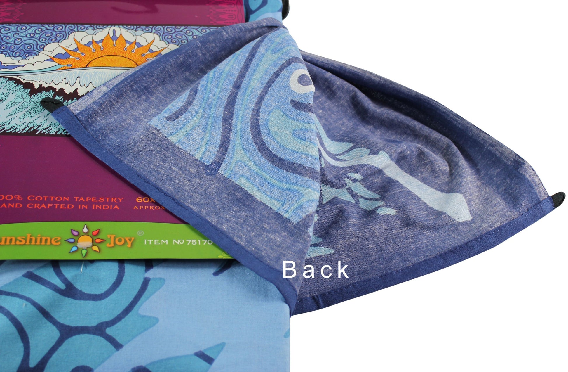 Sunshine Joy Sun Wave Tapestry -- In India, they are what locals use as bedcovers. People use them at home for tablecloths, bed-sheets, room dividers, curtains, window treatments, ceiling decor and to quickly cover up. - The corner loops make our tapestries the perfect multipurpose outdoor traveling companion. Secure your picnic sheet . At festivals, stake out an appropriate amount of space for your friends. Tie up a sunscreen at the campsite. Great at the beach as a windproof beach sheet or sun cover-up. 100% Cotton. Our tapestries are printed, not quilted or woven. They are hippie Indian tapestries. Thin as sheet. Good, tight power loom construction. Hemmed edges. The printing process is unique to India. Each tapestry has its unique imperfections. Sunshine Joy's tapestries are printed with a special soft fiber reactive dye. This is the same soft feeling of your favorite tie-dyed T-shirt. Some colors may show through the back side to give the impression that they are double sided with one side lighter than the other. Actually, they are only printed on one side. -- Size is approximately 5 feet by 7.5 feet. 60 inches by 90 inches 152 centimeters by 228 centimeters 1.52 meters by 2.28 meters. Fits a twin XL college dorm bed.Bold, vibrant designMeasures approximately 60 by 90 inches.Equipped with sturdy corner loops for easy hanging, tying & beach stakingHand crafted in India using traditional methodsMakes a great wall hanging, tablecloth, beach cover up, couch cover or window curtain