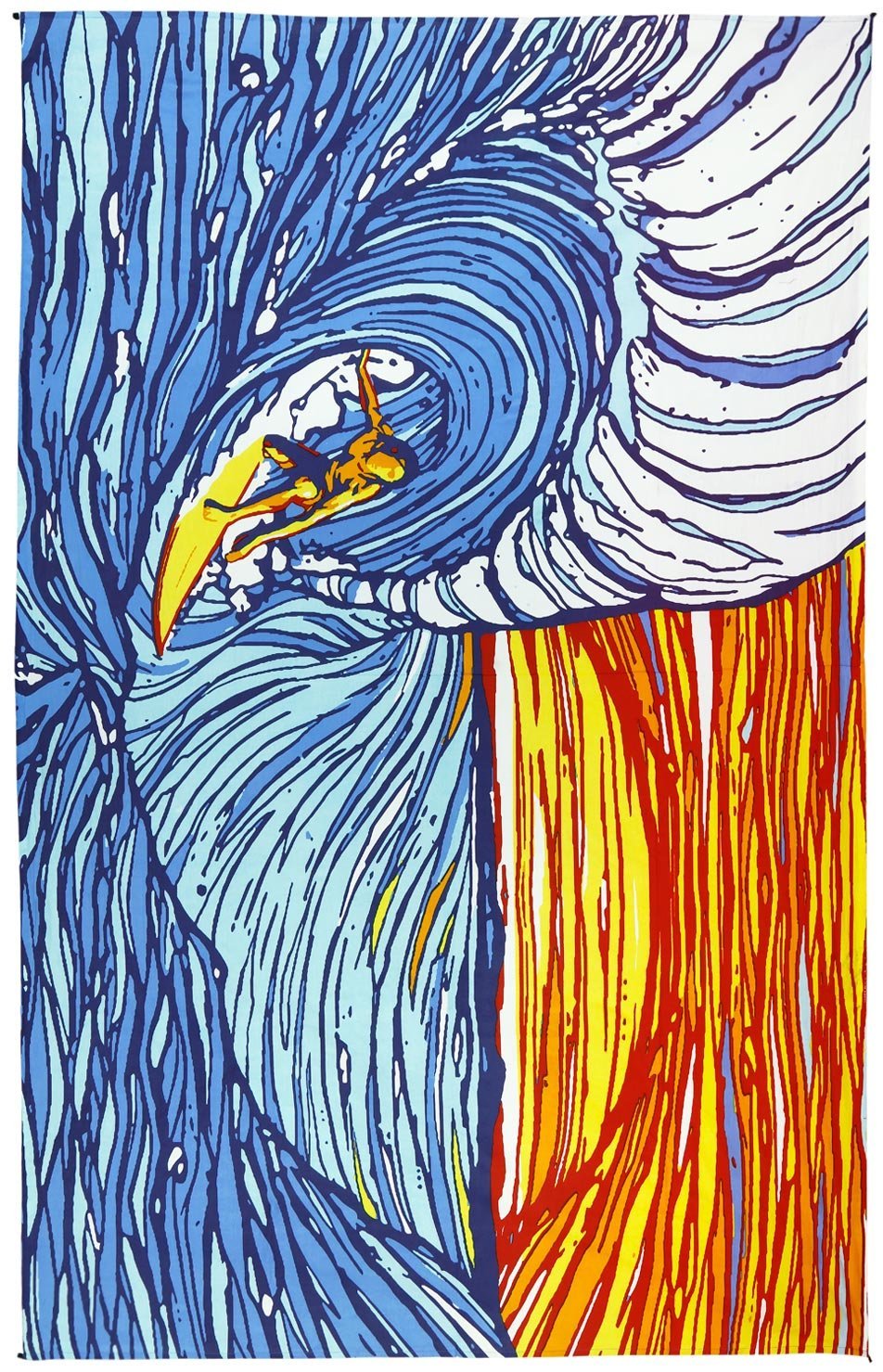 Sunshine Joy Sunset Surfer Beach Tapestry -- In India, they are what locals use as bedcovers. People use them at home for tablecloths, bed-sheets, room dividers, curtains, window treatments, ceiling decor and to quickly cover up. - The corner loops make our tapestries the perfect multipurpose outdoor traveling companion. Secure your picnic sheet . At festivals, stake out an appropriate amount of space for your friends. Tie up a sunscreen at the campsite. Great at the beach as a windproof beach sheet or sun cover-up. 100% Cotton. Our tapestries are printed, not quilted or woven. They are hippie Indian tapestries. Thin as sheet. Good, tight power loom construction. Hemmed edges. The printing process is unique to India. Each tapestry has its unique imperfections. Sunshine Joy's tapestries are printed with a special soft fiber reactive dye. This is the same soft feeling of your favorite tie-dyed T-shirt. Some colors may show through the back side to give the impression that they are double sided with one side lighter than the other. Actually, they are only printed on one side. -- Size is approximately 5 feet by 7.5 feet. 60 inches by 90 inches 152 centimeters by 228 centimeters 1.52 meters by 2.28 meters. Fits a twin XL college dorm bed.BOLD: Intricate psychedelic artwork of the perfect waveHUGE: Measures approximately 60 by 90 inchesLOOPED: Equipped with sturdy corner loops for easy hanging, tying & beach stakingREAL: Hand crafted in India using traditional methodsFUNCTIONAL: Makes a great wall hanging, tablecloth, beach cover up, couch cover or window curtain
