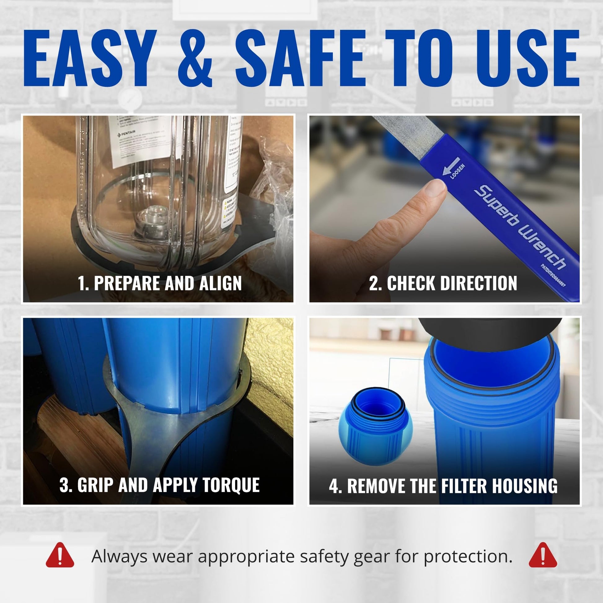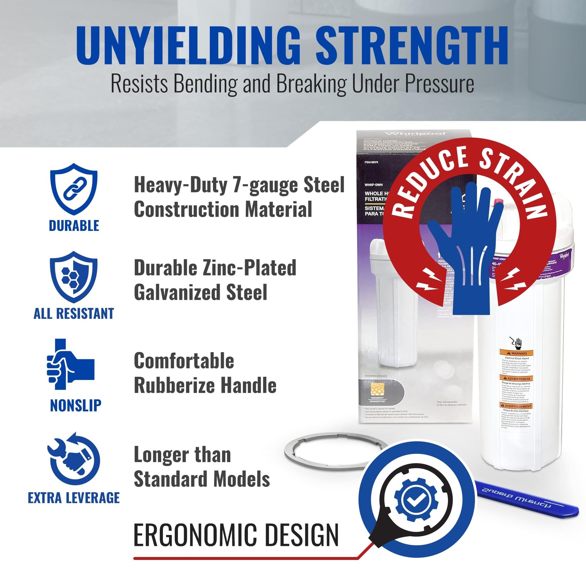 Superb Wrench HW-SL-MW4 Replacement Filter Housing Wrench, Silver/BlueSOLID CONSTRUCTION – Made out of 7-gauge galvanized steel, this heavy-duty zinc-plated metal filter wrench will not bend, bow or break when changing/removing stuck housings.ENHANCED CONTROL – This house water filter wrench features an easy-to-hold rubberized handle that is longer than standard plastic filter wrenches, ing more leverage and superior grip.QUICK AND EASY REPLACEMENT – This water filter wrench allows for quick and easy replacement by helping to lose even the most stuck or jammed filtration system housings.EASY TO USE – The metal filter wrench features a directional arrow label with word “loosen” imprinted to ensure turning the filter housing unit in the right direction for removal/change.COMPATIBLE WITH – This 3. 58” dia. water filter cartridge wrench fits most Pentek SW-1 # 150539 SW1 Slim Line, Culligan / Ametek / US Filter / Plymouth / Kleen Plus / American Plumber / Bruner, SW-1 water filter housing, and other slim line housings.