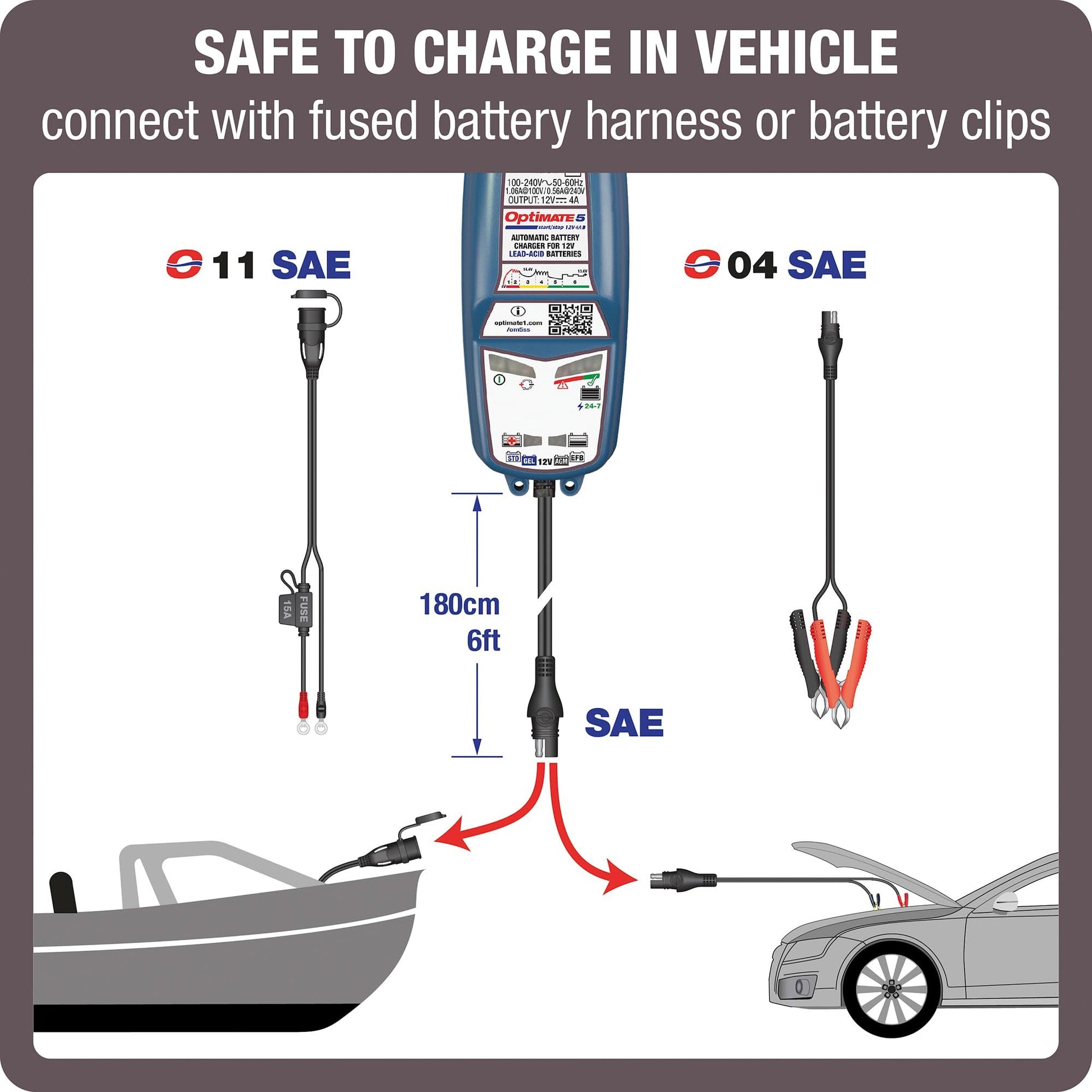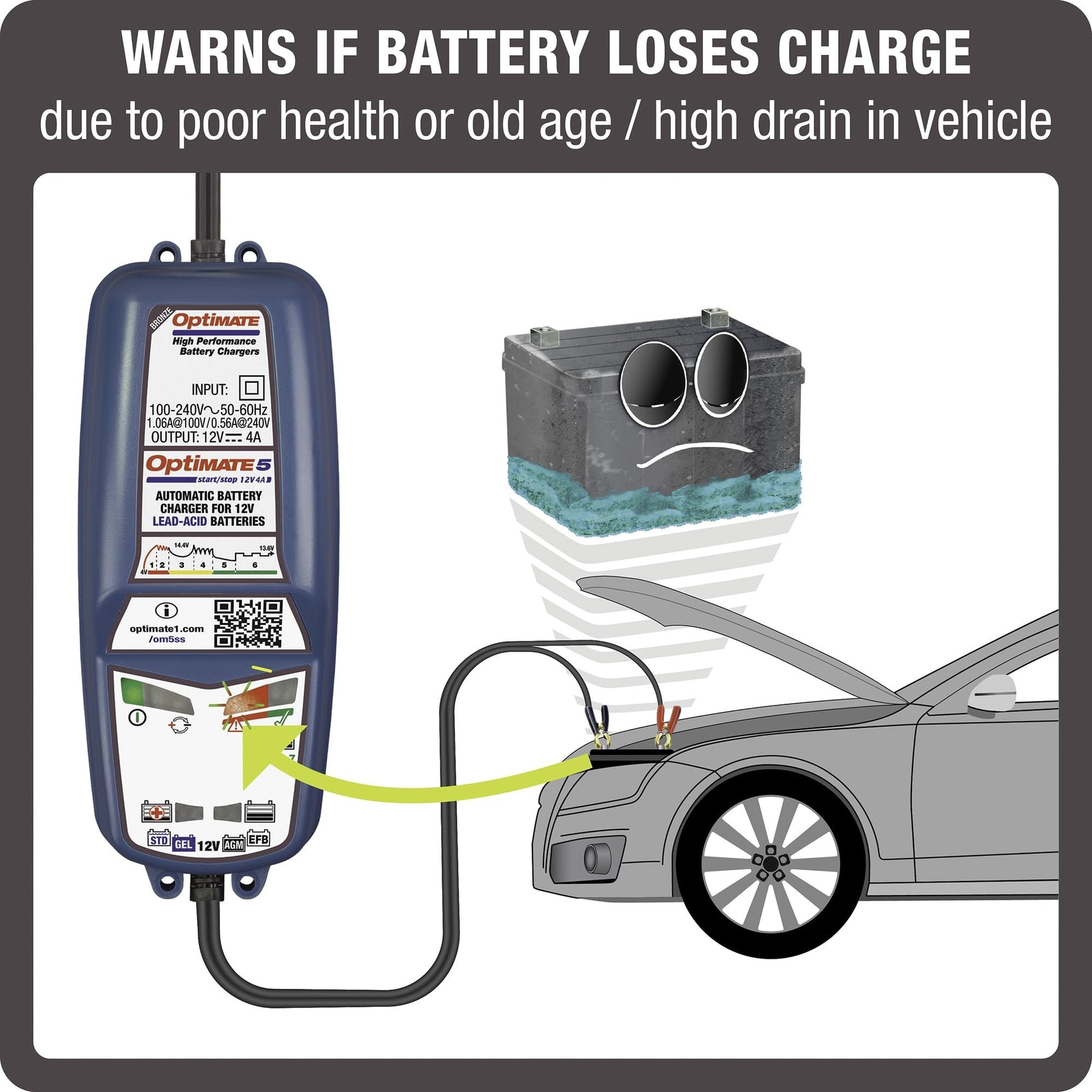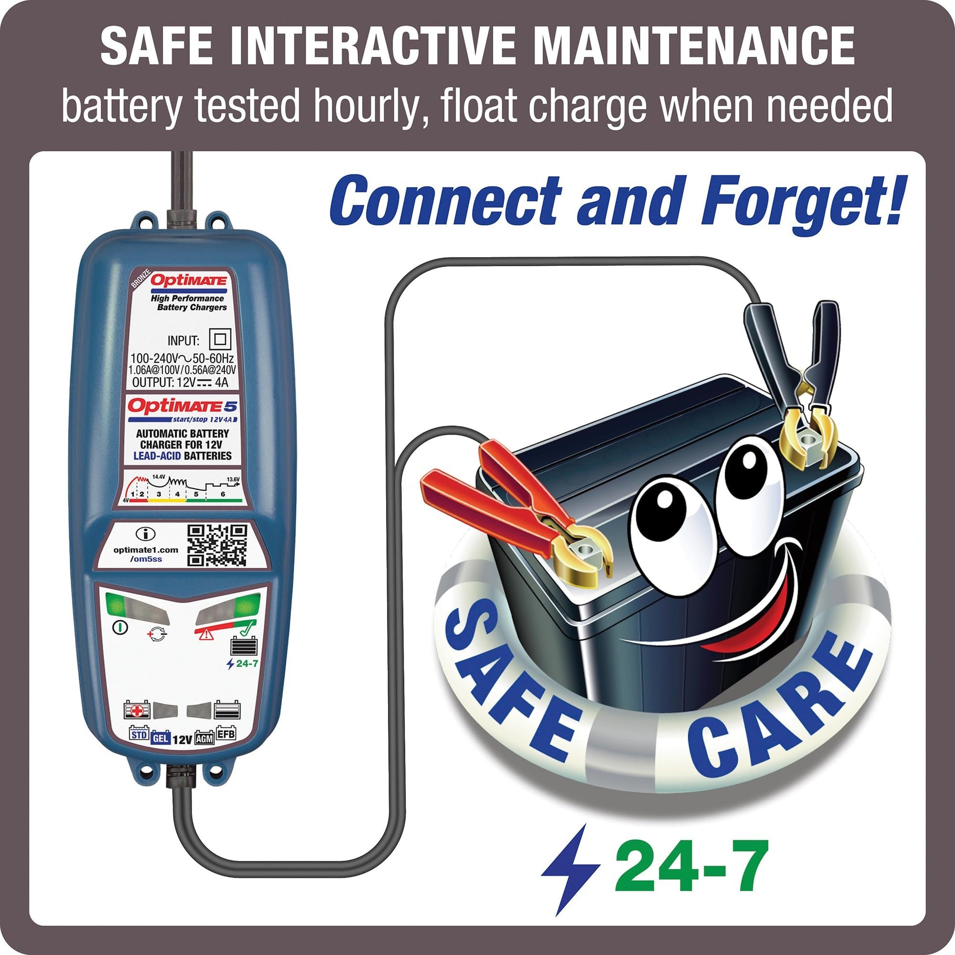 OptiMate 5 Start/Stop,12V 4A Automatic Battery charger & maintainer for Start/Stop, Hybrid Vehicles, AGM and Deep-Cycle Batteries (TM-221)A true "connect and forget" power charger & maintainer for your car, pick-up truck, hybrid vehicle or electrical car with ECO friendly Start/Stop Control.Ideal for all 12V engine start (SLI) batteries, including standard, flooded with filler caps and sealed EFB and AGM types.Charging is fully automatic. The automatic 6-step program saves a deep discharged battery from as low as 4 Volts and will then charge and maintain the battery, all automatically with long-term maintenance mode that keeps the battery at its optimal level 24-7.Tests battery state of health and warns if the battery loses charge. Due to poor health of battery/age. Or a high drain in the vehicle indicating other issues.Safe to charge in vehicle with provided O-11 fused battery harness or O-04 battery clips. No risk of overcharging. Totally safe for vehicle electronics. Sparks suppressed. Safe for long-term battery maintenance. Automatic shut-down if short-circuited or battery disconnected.