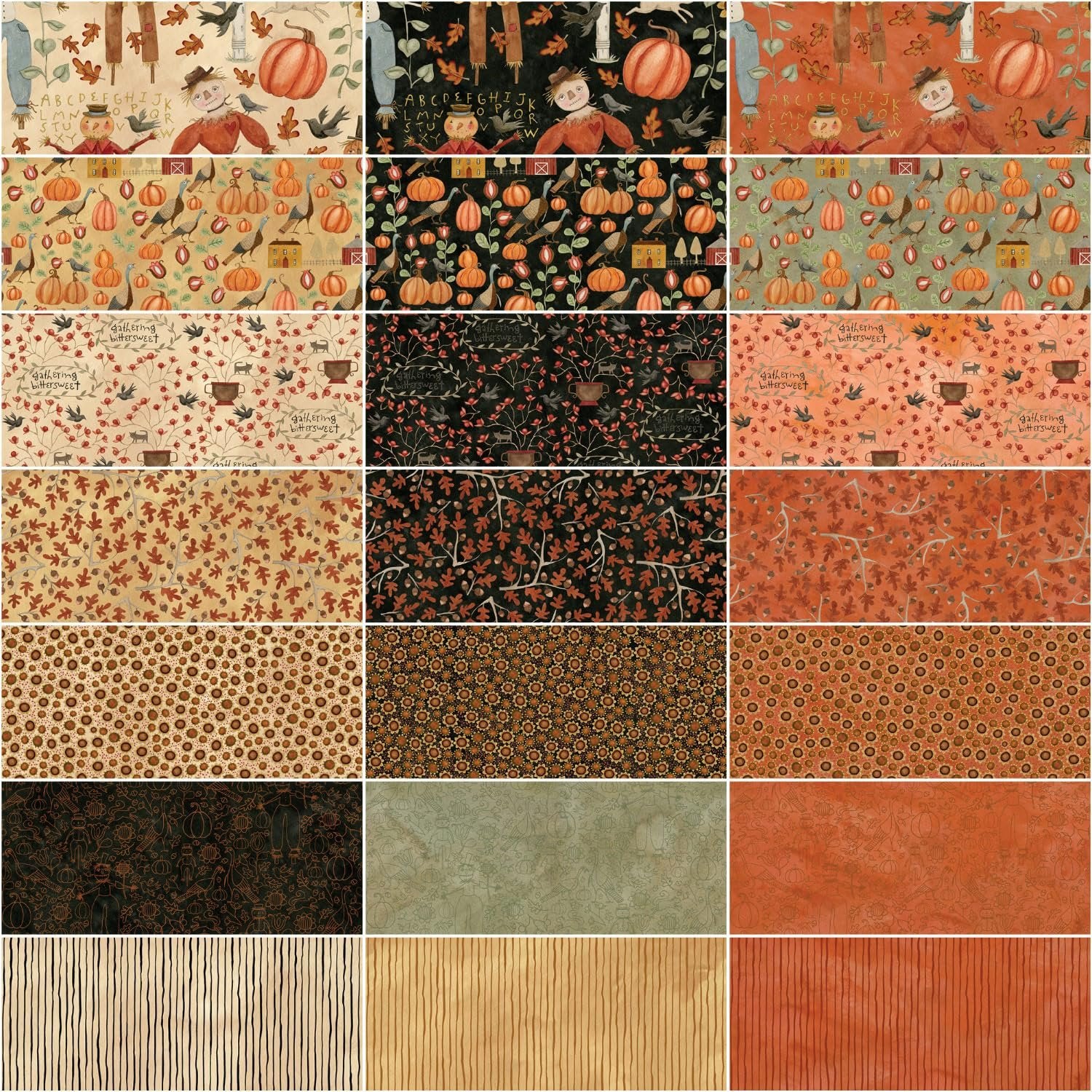 Fabric bundle of 21 18-inch by 22-inch fat quarters from the Bittersweet Farm collection by designer Teresa Kogut for Riley Blake Designs. There's nothing scary about Teresa Kogut's designer fabric collection Bittersweet Farm. Featuring a gourd-geous palette of cornsilk, harvest gold, squash, and midnight Teresa's original watercolor artwork ushers in the fall season. Mister scarecrow and his friends have done their job to protect the crop while making friends with those pesky little critters. You will fall in love over and over again as you create fall quilts and home decor projects. Make yourself pumpkin spice latte and enjoy leaves, acorns, sunflowers, and other fall icons that make up this beautiful collection.Bittersweet Farm collection from Riley Blake DesignsDesigned by Teresa KogutFat Quarter Bundle includes 21 18-inch by 22-inch fat quarters100% Cotton; premium quilt shop quality fabric