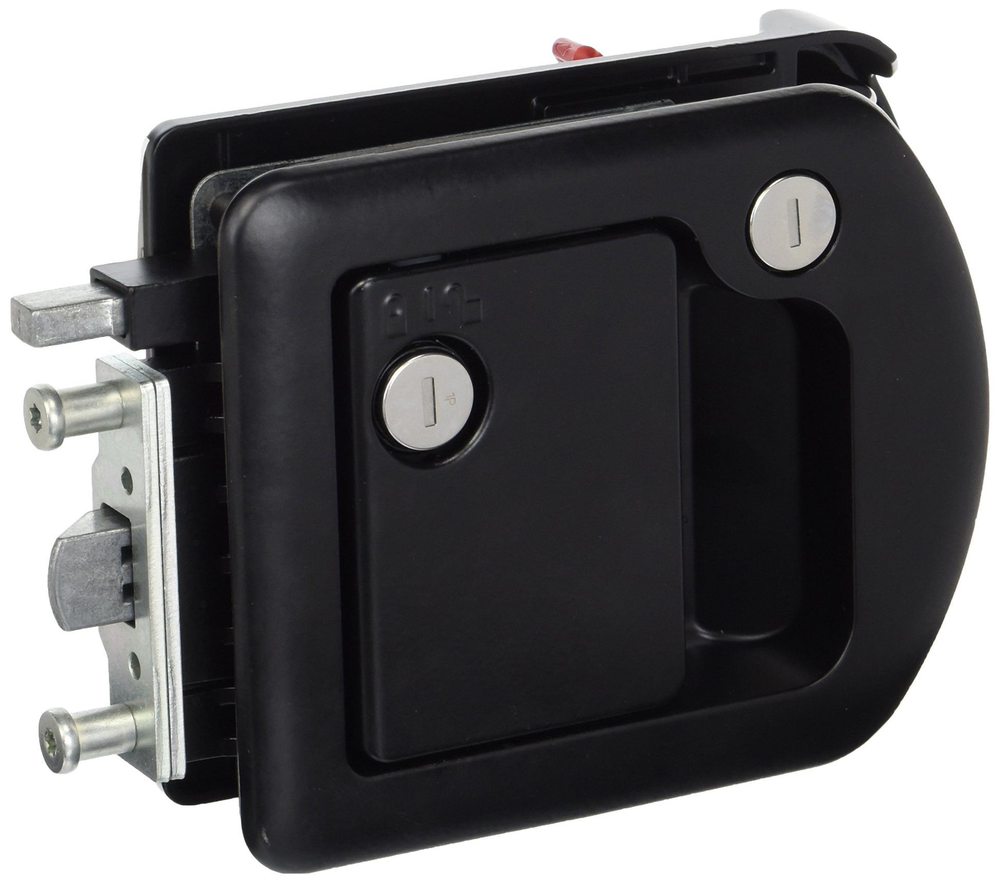 Designed for motor home and fifth wheel trailer entrance doors and is a redesign of our 060-0650 Motor Home Entrance Door Hardware. It features easy installation with through sandwich mounting, a low profile plunger style latch which is compliant to FMVSS 206, a built-in dead bolt for additional security and is power lockable.5-3/4" wide x 5-1/4" heightInterior & Exterior Assembly2 Sets of Keys (one set for each lock) and 2 screwsBlack powder coatedMotor home entrance doors with thickness of 1.390" (35.3mm) to 1.600" (40.6mm)