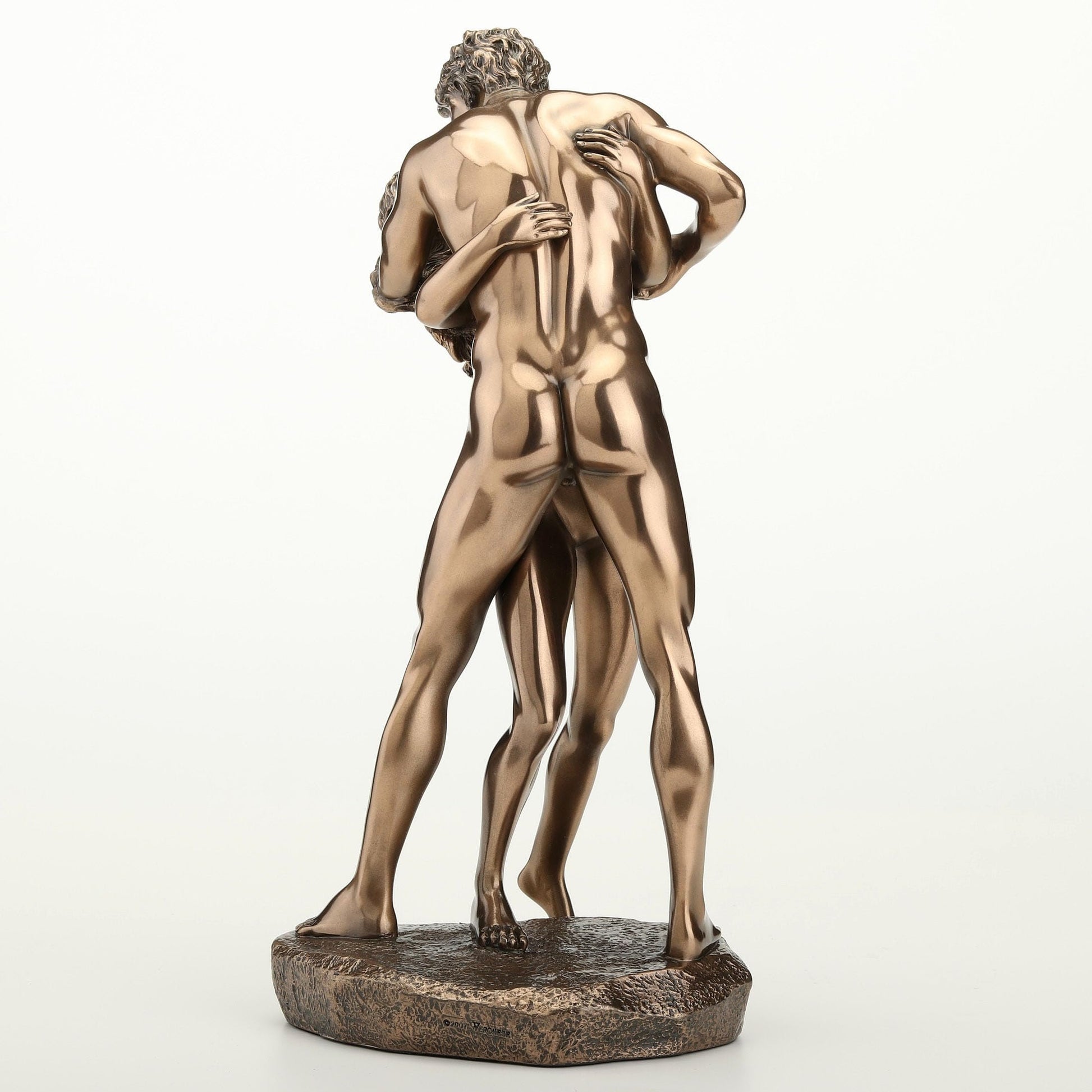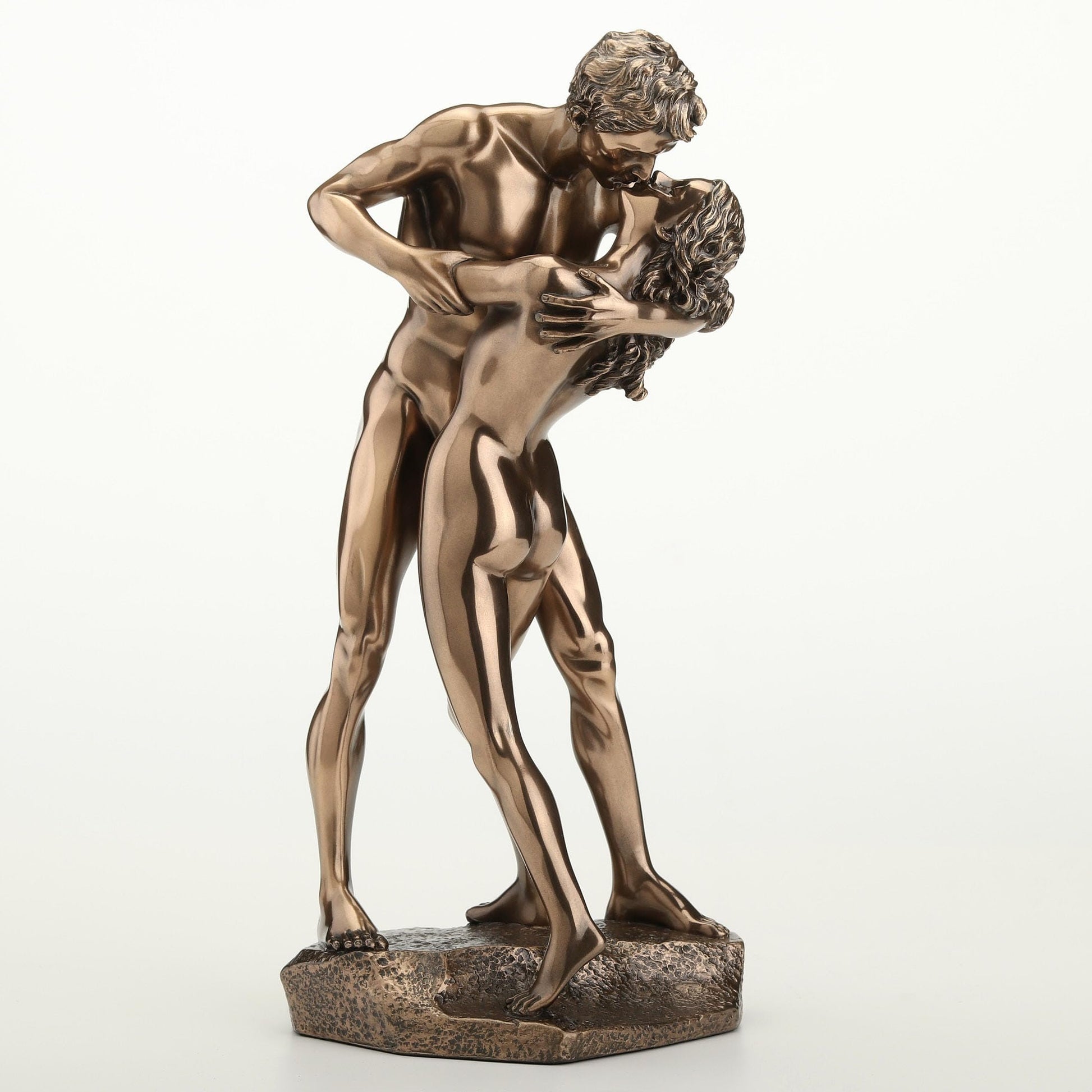 Capturing the intimate and timeless embrace akin to Rodin's iconic "The Kiss," this exquisite sculpture portrays a standing couple locked in a tender kiss, their forms melding into an elegant unity. Crafted with intricate detail, the piece is made of cold cast resin with a bronze finish, lending it a classical and sophisticated appearance. The figures exude a palpable sense of passion and connection, their bodies seamlessly intertwined in a moment of pure love and affection, making it a captivating centerpiece for any space.QUALTIY PRODUCTION: Made with high quality designer resin and cold cast bronze techniqueCOLD CASTING: Cold casting is the technique that mixes resin and bronze to create detailed sculpture with metallic featuresMEASUREMENT: L 5 1/2 * W 4 3/4 * H 11 3/8 InchesGIFTING: Perfect gifting and home decor option for all collectorsPACKAGING: Gift box ready with black felted bottom protection