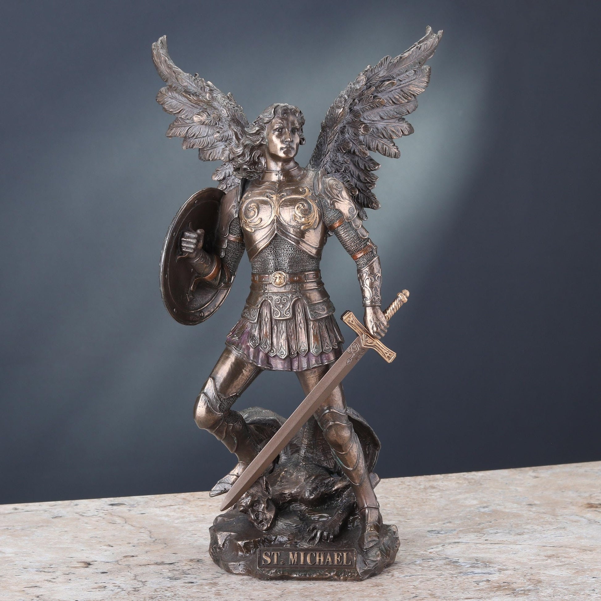 Saint Michael the Archangel is a prominent figure in Christian tradition, known as a warrior and protector in the battle against evil. Often depicted as a valiant angel wielding a sword or spear, Saint Michael is celebrated for leading the heavenly forces in their triumph over Satan and his fallen angels, as described in the Book of Revelation. He embodies courage, strength, and divine justice, serving as a guardian of the faithful and a symbol of hope in the face of adversity. Saint Michael is venerated in various Christian denominations and is the patron saint of soldiers, police officers, and those seeking protection.QUALITY PRODUCTION: Made with high quality designer resin and cold cast bronze techniqueCOLD CASTING: Cold casting is the technique that mixes resin and bronze to create detailed sculpture with metallic featuresMEASUREMENT: L 7 1/8 * W 5 3/4 * H 12 7/8PACKAGING: Gift box ready with black felted bottom protectionGIFTING: Perfect gifting and home decor option for all collectors