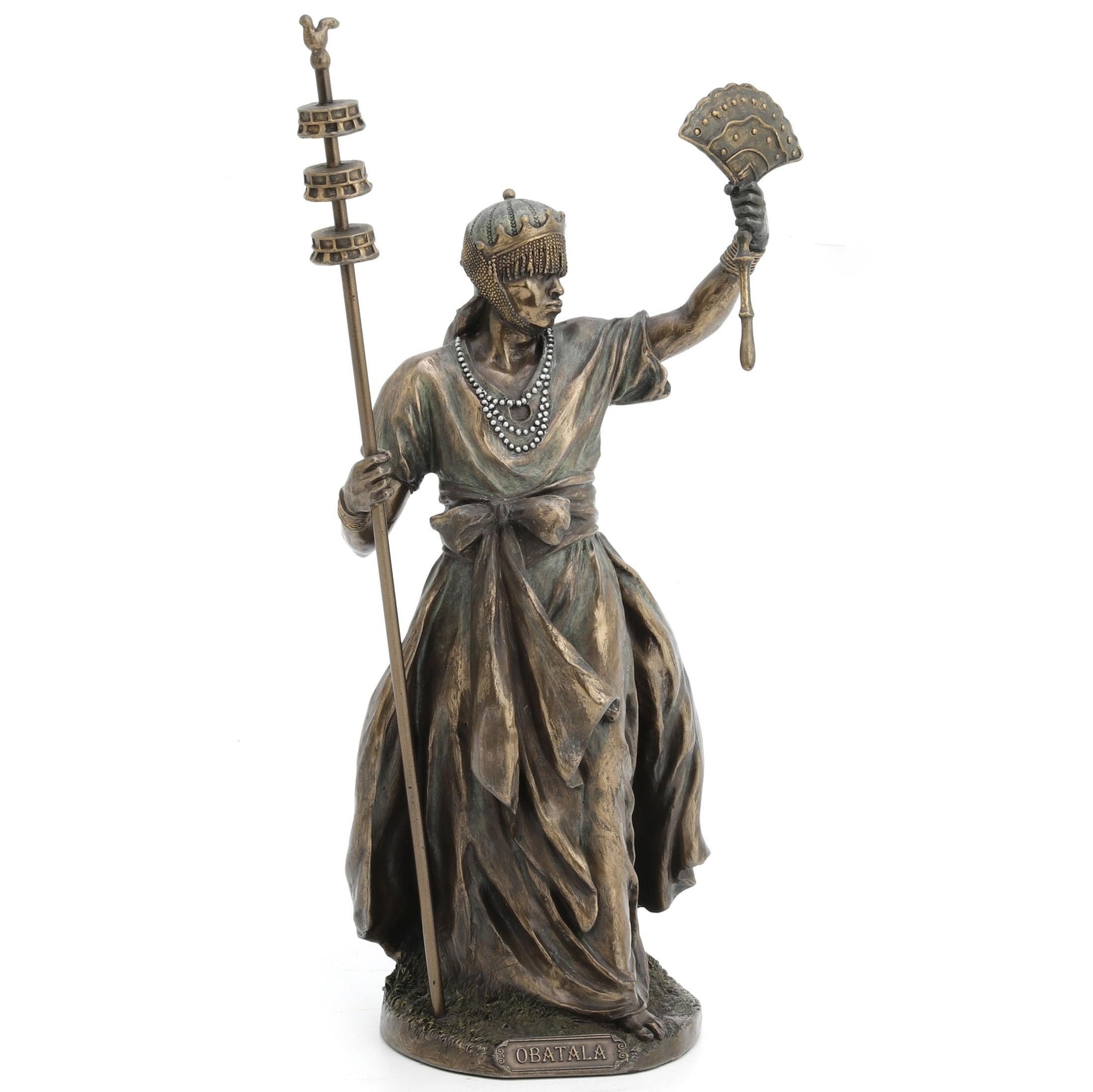 Obatala, in the Santeria religion, is one of the most respected Orishas (deities). He is considered the father of all other Orishas and is often associated with creation and purity. According to the beliefs, Obatala is entrusted by Olodumare, the Supreme God, with creating the world and all humanity. This deity is typically symbolized by white which represents purity, wisdom, peace, and morality. Obatala is highly worshipped because of his role in the creation and harmonious existence of mankind. He is also known to intercede in legal and justice matters.QUALITY PRODUCTION: Made with high quality designer resin and cold cast bronze finishMEASUREMENT: L 6 1/8 * W 4 * 12 InchesGIFTING: Gift box ready with black felted bottom protection