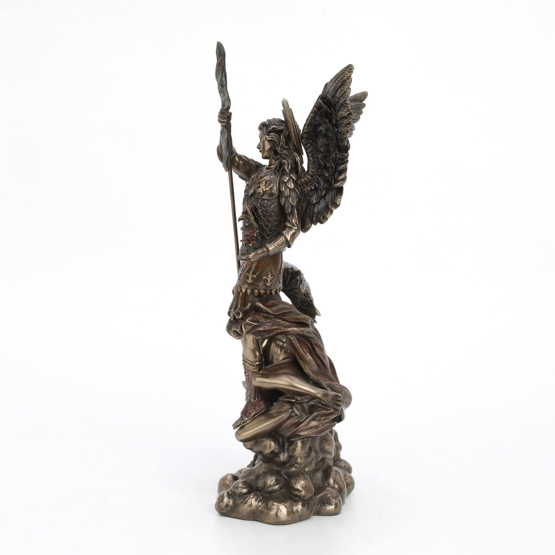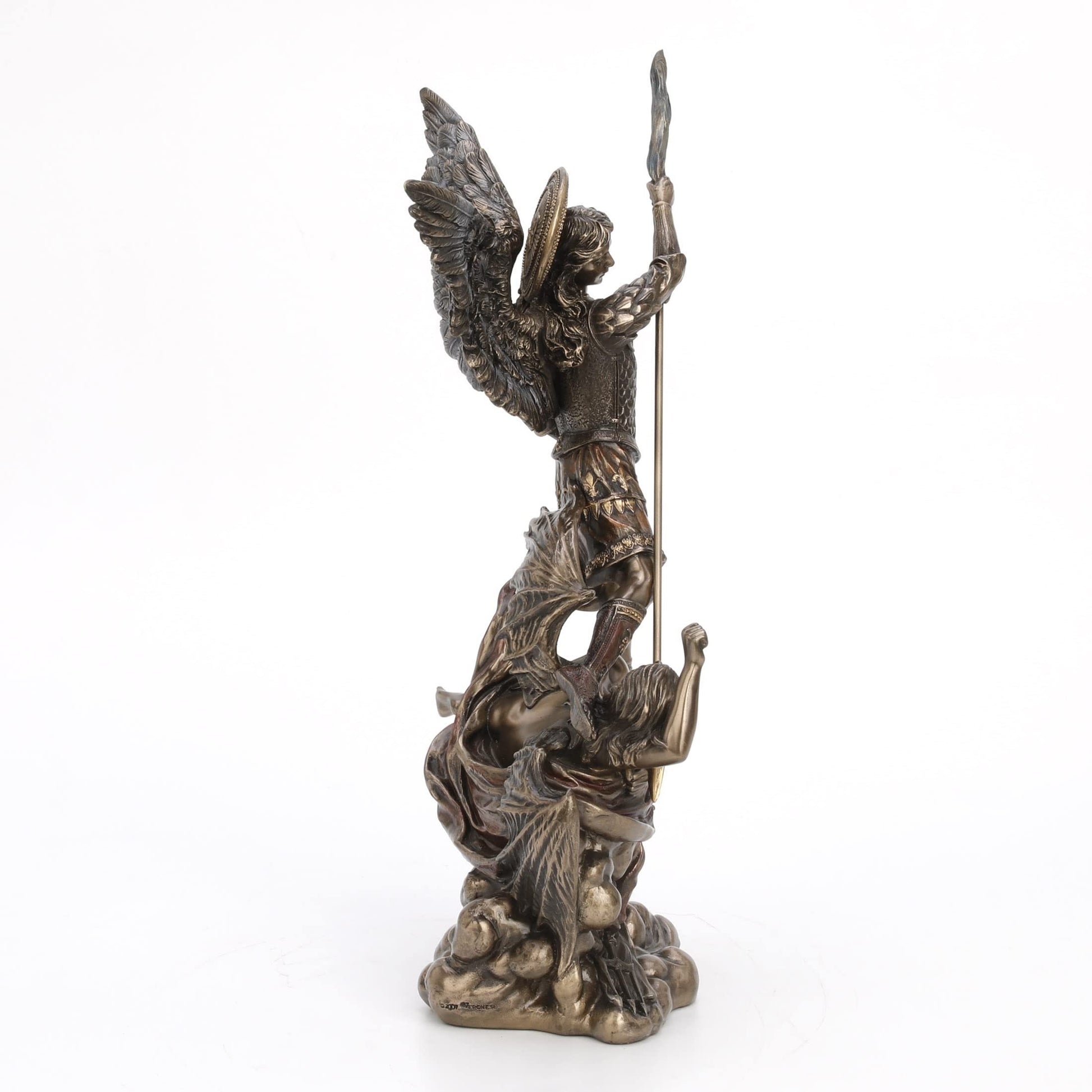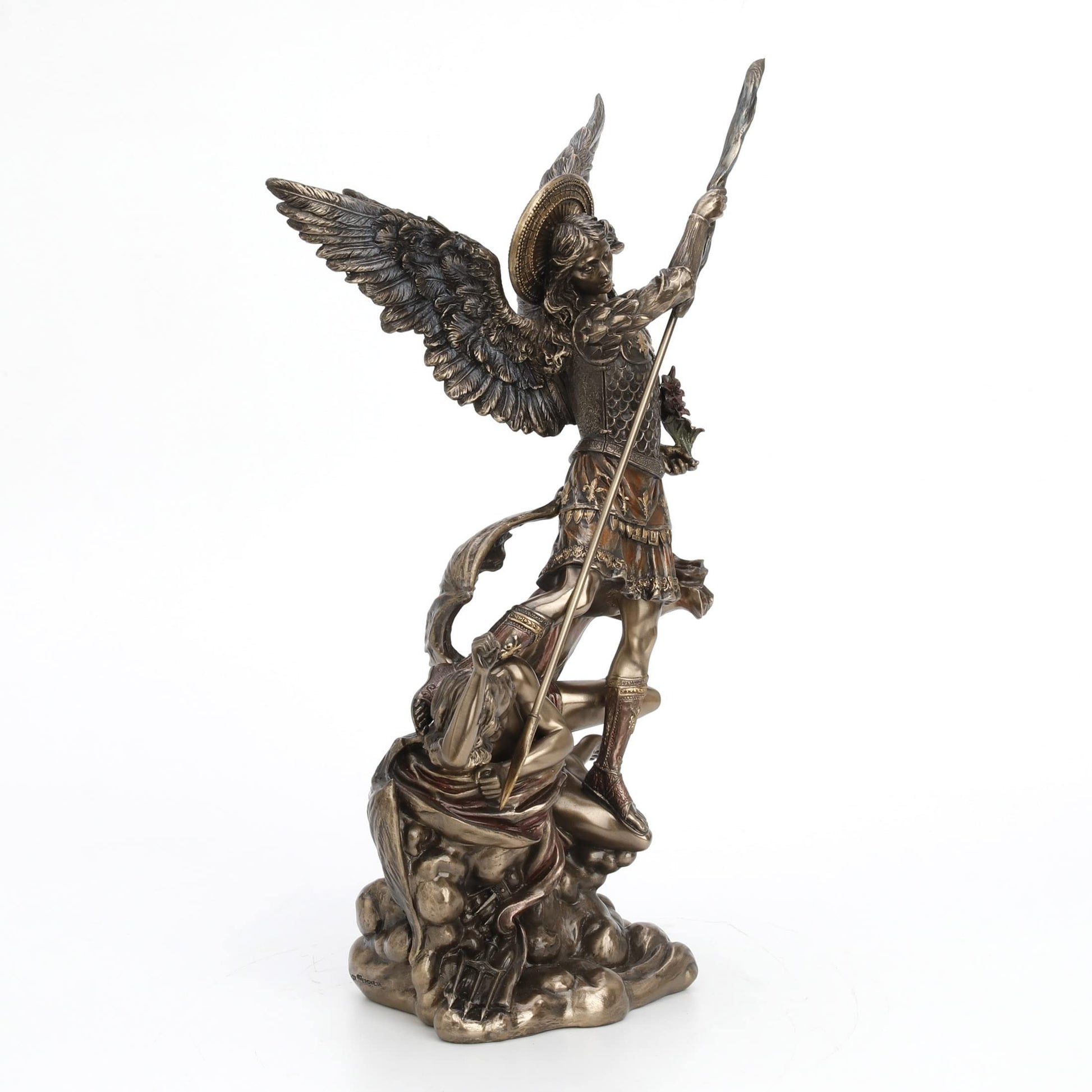 Featuring Archangel Saint Michael dominating the devilMade with high quality designer resin using cold cast bronze methodCold Casting is the process of mixing bronze and resin material in order to create resin statue with metallic textureSize(Inch): Length 9" Width 5 1/8" Height 13 1/4"Gift Boxed with felt bottom