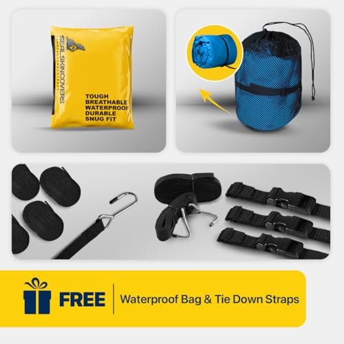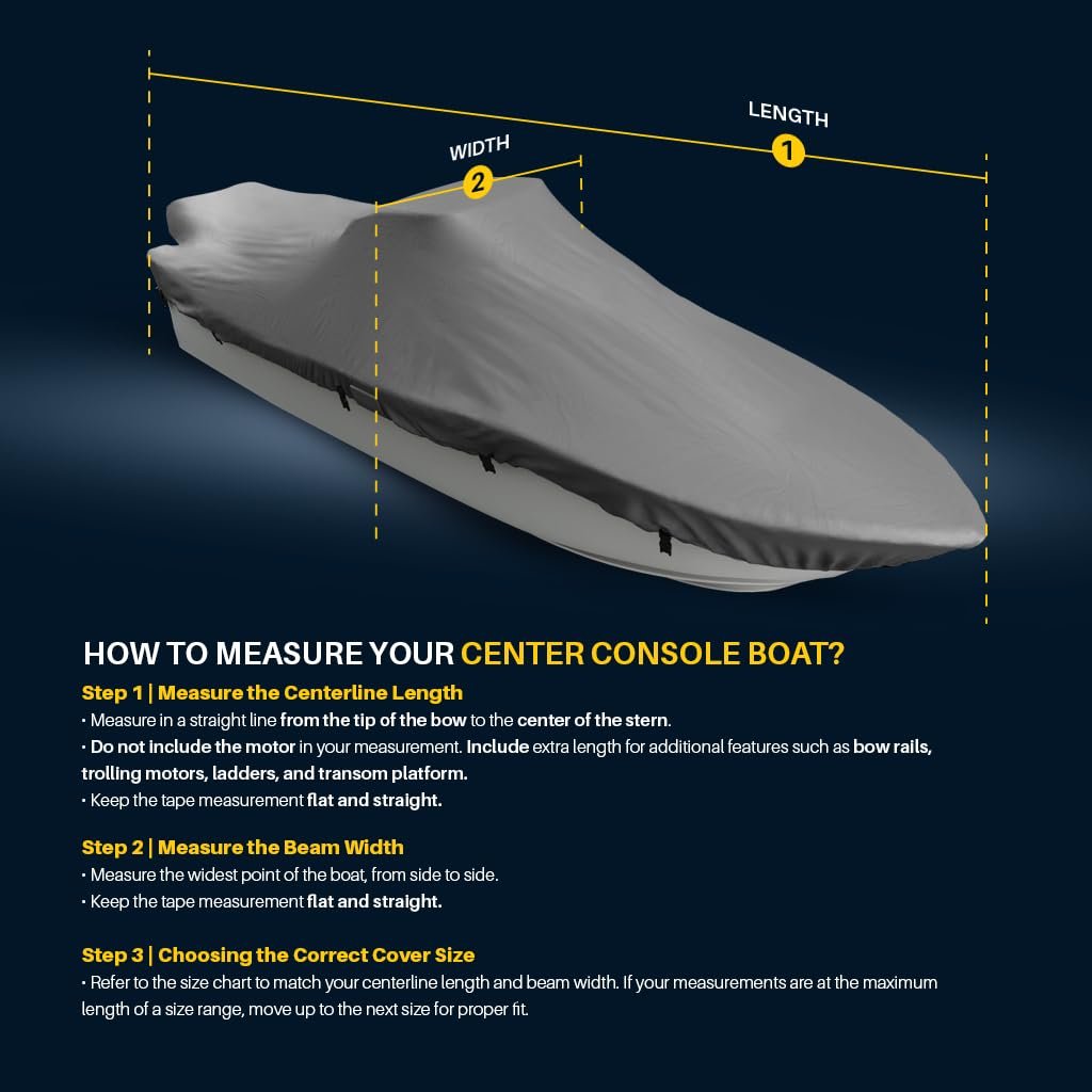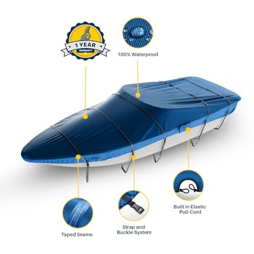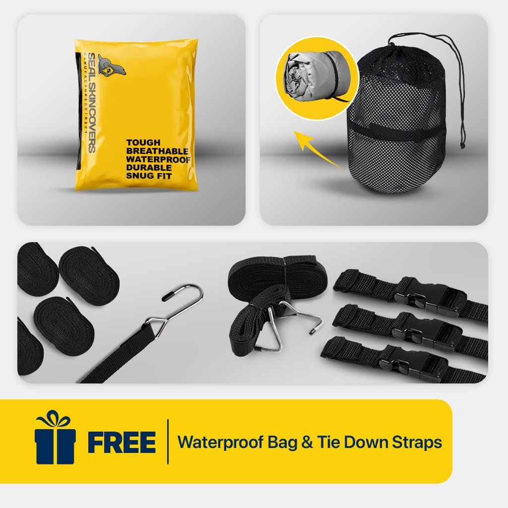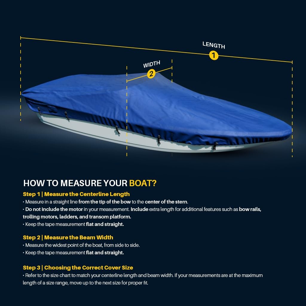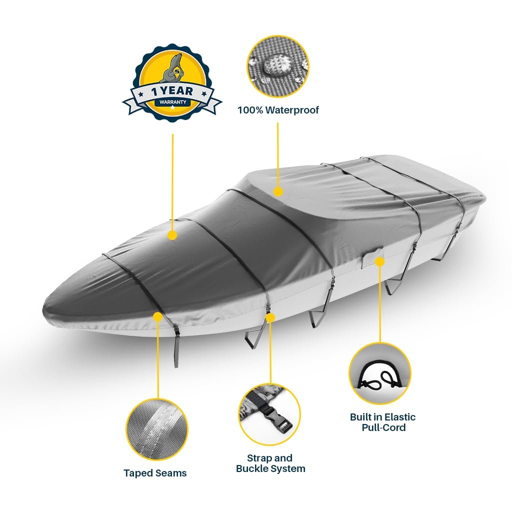 Experience the ultimate protection for your boat with the Seal Skin Covers V Hull Boat Cover. Designed specifically to fit 14 ft boats, our cover provides comprehensive coverage, safeguarding your investment from harmful elements. This boat cover is a must-have among boat accessories. Featuring robust boat cover straps, our 14 ft boat cover ensures a snug and secure fit to your boat, preventing it from flapping even in high winds. The boat cover straps are easy to adjust, making it a practical addition to your boat accessories. It's perfect for a jon boat, small boat, or even a bass boat, making it a versatile addition to your boating accessories. Crafted from waterproof fabric, our boat cover not only shields your boat from rain but also UV rays, dust, and bird droppings. This waterproof cover is ideal for both indoor and outdoor use. It's a quintessential item among jon boat accessories and bass boat accessories. Our Seal Skin boat cover is also available in larger sizes, from boat covers 17-19ft, boat cover 20-22 ft, to boat covers 22-24ft, catering to a wide range of boat sizes. If you own a center console boat, we also offer a specialized center console boat cover. For those who require additional protection, we offer a boat motor cover. Just like our boat covers, our boat motor cover is durable, waterproof, and easy to use. Whether you need a jon boat cover, a bass boat cover, or even a boat cover for a v hull, Seal Skin Covers has got you covered. Our boat covers are not just functional but also aesthetically pleasing, adding a touch of elegance to your boat. Elevate your boating experience with Seal Skin Covers. We don't just offer boat covers but a wide array of boat accessories marine. So why wait? Secure your boat today with our superior quality boat cover.𝗦𝗡𝗨𝗚 𝗙𝗜𝗧: Elastic hem and adjustable straps with durable buckles provide a snug, wind-resistant fit that keeps the cover securely in place during transport and storage.𝗪𝗔𝗧𝗘𝗥𝗣𝗥𝗢𝗢𝗙: Marine-grade polyester with double-stitched, taped seams ensures complete waterproof protection, shielding your boat from rain, snow & saltwater.𝗪𝗔𝗥𝗥𝗔𝗡𝗧𝗬: Backed by a 1-year warranty, offering protection against defects, rips, and tears for worry-free use. If you have any questions or are not sure about the size, feel free to contact us.𝗧𝗥𝗔𝗜𝗟𝗘𝗥𝗜𝗡𝗚: Includes an installation guide, six 4-meter straps, two 0.85-meter buckles & a storage bag for hassle-free setup & transport. Make sure to dry and clean the area before storing.𝗗𝗨𝗥𝗔𝗕𝗜𝗟𝗜𝗧𝗬: Reinforced corners and high-strength fabric ensure long-lasting performance. Designed to withstand bad weather and daily wear for reliable protection.