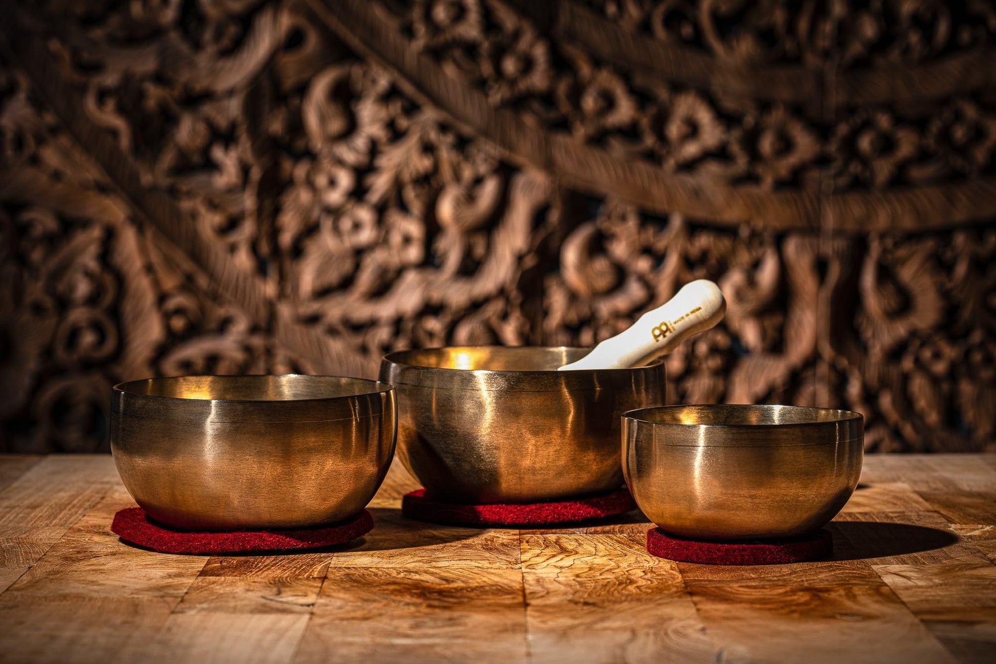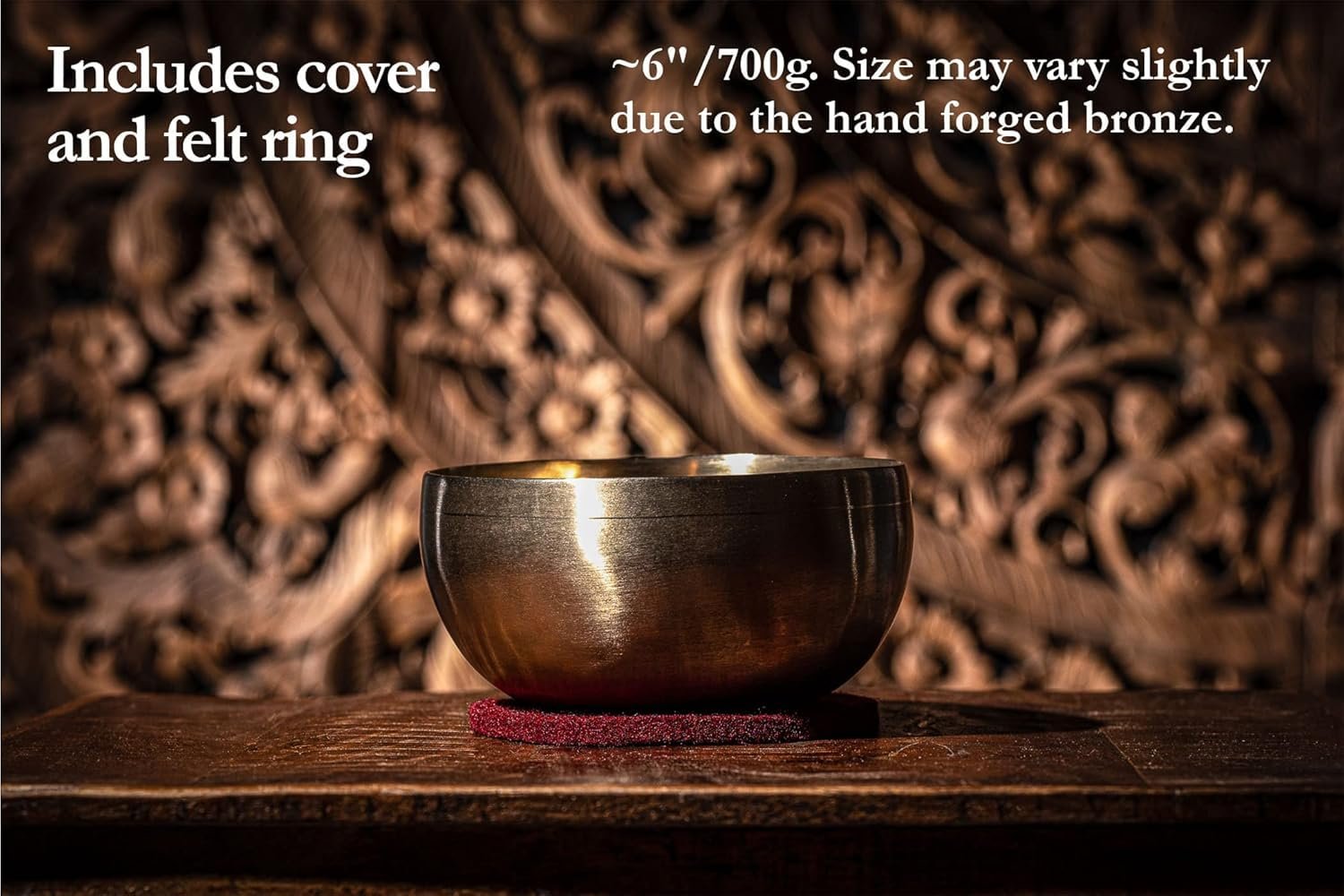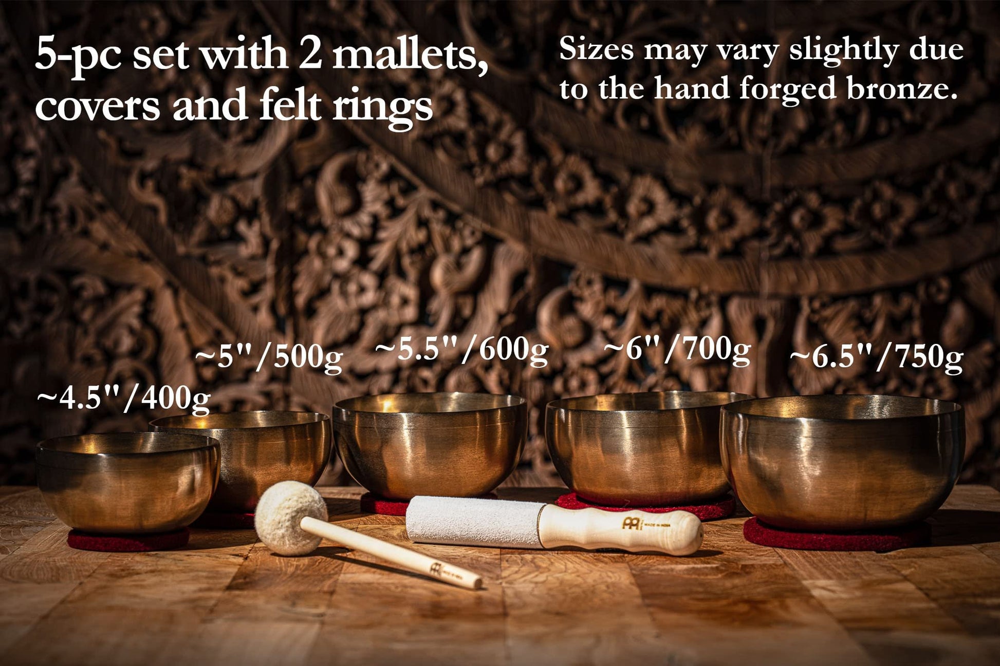 3 Piece Bronze Singing Bowl Set with Mallet, Felt Rings and Covers, Universal Series — MADE IN INDIA — For Meditation, Yoga and Sound Healing Therapy, 2-YEAR WARRANTYUniversal Series — natural yet highly refined and fit for any situation, the Meinl Sonic Energy Universal Singing Bowl has a classic shape and matte finish with an engraved logo on the inside bottom of the bowlThree-piece set — includes three Universal Singing Bowls (SB-U-400 / 4.5", SB-U-500 / 4.9", SB-U-600 / 5.5") plus a leather wrapped wooden resonating mallet (SB-RM-LE) — bowl sizes and weights may vary slightly due to the hand made shapeBronze alloy masterpiece — we forge our bronze alloy to produce a long-sustaining, soothing ring when tapped or rubbed with a singing bowl mallet — this alloy fills the space around you with ethereal sound waves of calming overtonesHandcrafted in India — made in India by experts who shape the tone by hand hammering the bronze until a desired size and pitch is met — measures 6.5" in diameter and weighs around 750 grams (size and weight may vary slightly due to the hand made shape)Ideal for meditation, yoga or sound healing therapy — this singing bowl fits a variety of settings from yoga studios, close meditation spaces or sound baths in large, wide-open rooms — it's also perfect for using at home to relax or meditate on your ownIncludes covers and felt rings — to achieve the best possible sound, we include felt rings that correspond to the size of the bowls that you can use to rest the bowls on as you play — soft covers are also included for convenient storage and travelDesigned in Germany — Meinl is a family-owned musical instrument manufacturing business that was established in Germany in 1951 — our expert German designers have deep relationships with our builders to ensure you're delivered the absolute finest quality