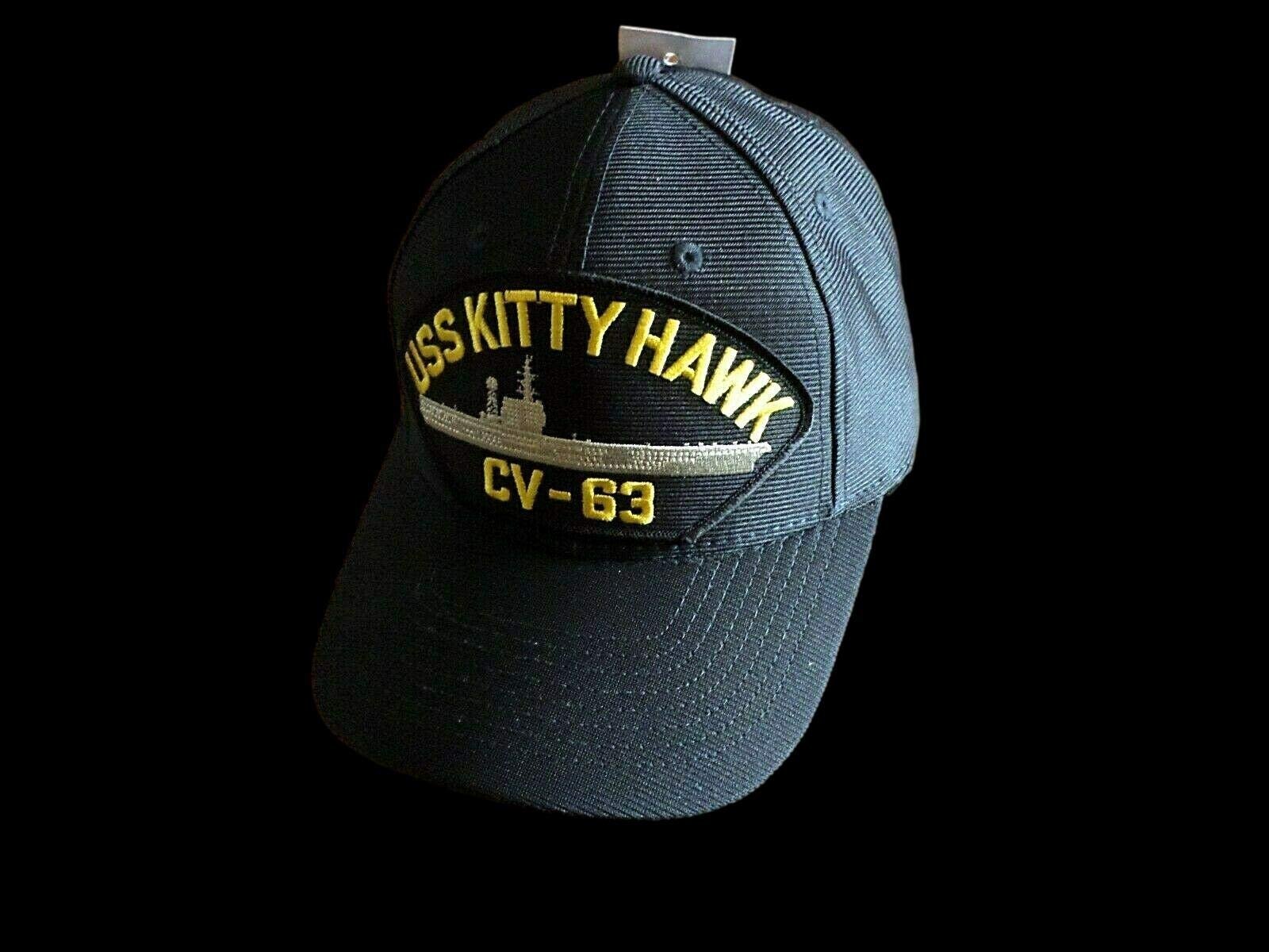 USS KITTY HAWK CV-63 US NAVY SHIP MILITARY BALL CAP. HATS ARE THE OFFICIAL MILITARY HEAD WEAR. MADE IN THE USA. ALL HATS ARE NEW IN BAGS AND FULLY ADJUSTABLE. VERY GOOD QUALITY HATS. ALL OF OUR HATS ARE IN STOCK AND SHIPPED SAME DAY OR NEXT BUSINESS DAY IN A STURDY BOX FOR SAFE DELIVERY.