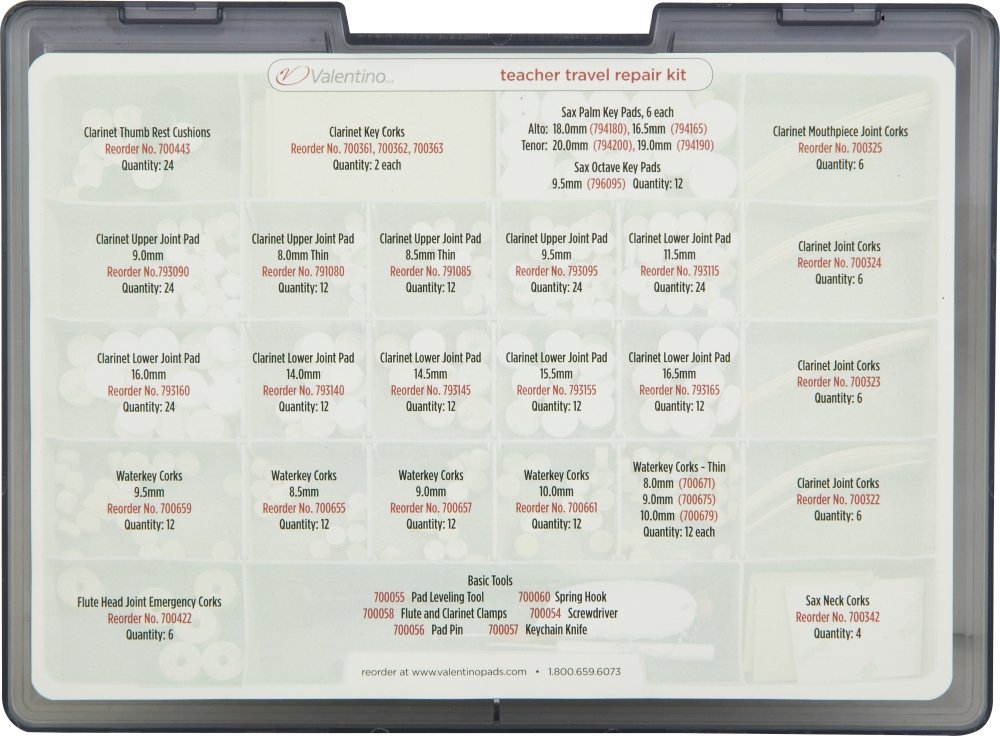 A Must-have for Classical Music Educators The Valentino Teacher's Traveler Repair Kit is like having a portable medic on standby for your students' woodwind and brass instruments. This jam-packed kit comes loaded with many of the most crucial components of a wind instrument, with pads, cork replacements, thumb rests, and more — all organized in a compact carrying case. Sweetwater's woodwind and brass experts love this comprehensive approach to quick instrument fixes. With it in tow, you'll be capable of saving performances at a moment's notice with no negative impact on sound or feel. Be prepared for any musical mishap with Valentino's Teacher's Traveler Repair Kit!Valentino Teacher's Traveler Repair Kit Features: Portable repair kit for woodwind and brass instruments Includes pads, cork replacements, thumb rests, joint and neck corks, tools, and instructions Carrying case keeps things organized and easy to transportBrass/Woodwind Repair Kit with PadsCk ReplacementsCarrying CaseThumb RestsTools