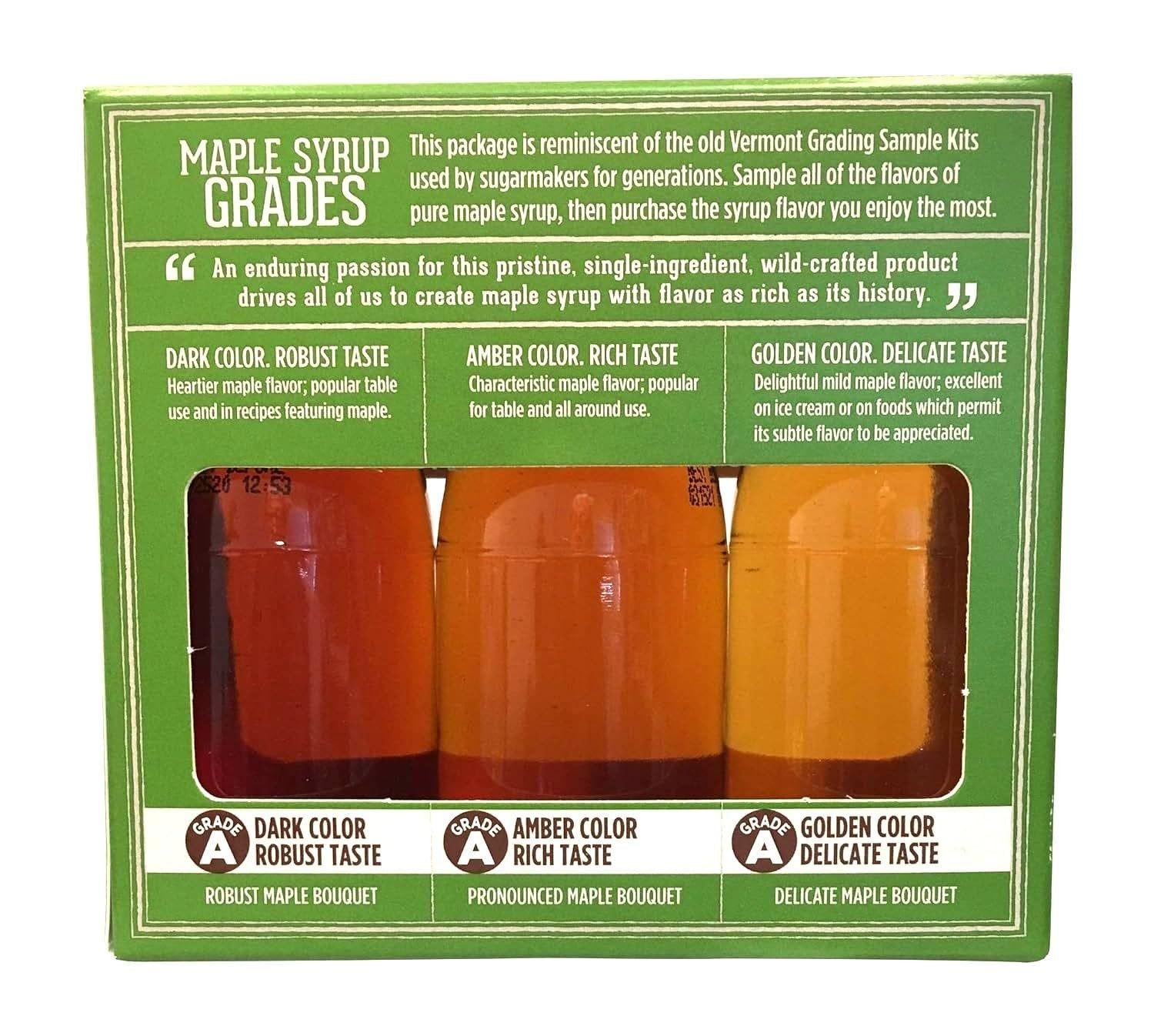 Discover the rich and diverse flavors of Vermont with the Butternut Mountain Farm 100% Pure Vermont Maple Syrup Grading Sampler. This unique set includes one 1.7 fl. oz. bottle of each of Vermont’s distinct maple syrup grades, allowing you to explore the varying tastes and qualities from light and golden to dark and robust. Whether you're a maple syrup connoisseur or new to the world of maple syrup, this sampler offers a perfect opportunity to compare and experience the full spectrum of flavors.Explore Vermont's Maple Syrup Grades – Includes a selection of 1.7 fl. oz. bottles, each representing a distinct maple syrup grade, showcasing the diverse flavors of Vermont's maple100% Pure Maple Syrup – Made from sustainably tapped maple trees in Vermont, offering an all-natural, rich, and sweet taste with no additives or preservatives.Perfect for Tasting & Comparing – Ideal for those who want to experience and compare the different grades of maple syrup, from light and golden to dark and robust.Great for Gifting – Beautifully packaged, this sampler is an excellent gift for food lovers, maple syrup enthusiasts, or anyone looking to explore the true taste of Vermont.