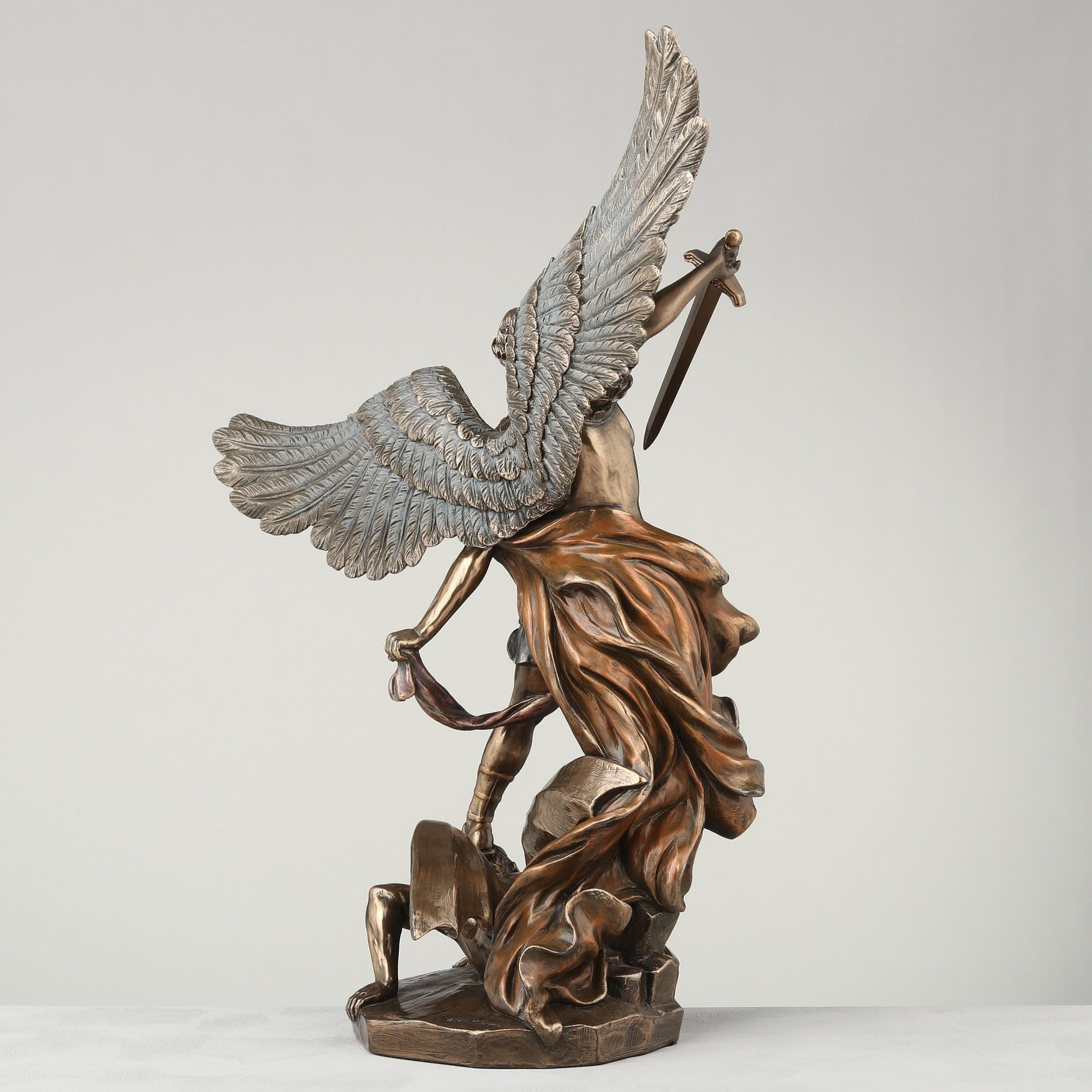 Veronese Design 14.5 Inch Archangel St. Michael Tramples Demon Religious Sculpture Defeating Lucifer Collectible Angel Figurine. Premium sculpted cold cast bronze - real bronze powder mixed with resin. Hand-painted in bronze finish to give a high-quality antique look without sacrificing the details. Unmatched Top Collection quality - Museum grade design & material. The intricate craftsmanship of this brand is simply breathtaking. COLLECTIBLE - Measures approximately 14.5 inches tall, 11 inches wide, and 5 inches long. Beautiful décor to display in your home, office desk, or library bookshelf. Great addition to any collection of Catholic figures or the seven archangels. UNIQUE PRESENT - Packed in a beautiful gift-box ready for any occasion. Ideal for Catholic friends or family. Also a great gift to anyone that loves Angel figurines. STUNNING PRESENTATION - This statue depicts a scene from the Book of Revelation, which describes a "war in heaven" between angels led by the Archangel Michael against the fallen angels led by "the dragon", or Satan, who are defeated and thrown down to the earth.Made with high quality designer resin and cold cast bronze finishCold casting is the technique of mixing resin and bronze powder to create detailed sculpture with metallic finishMeasurement: L 9 1/2 * W 5 3/4 * H 14 1/8