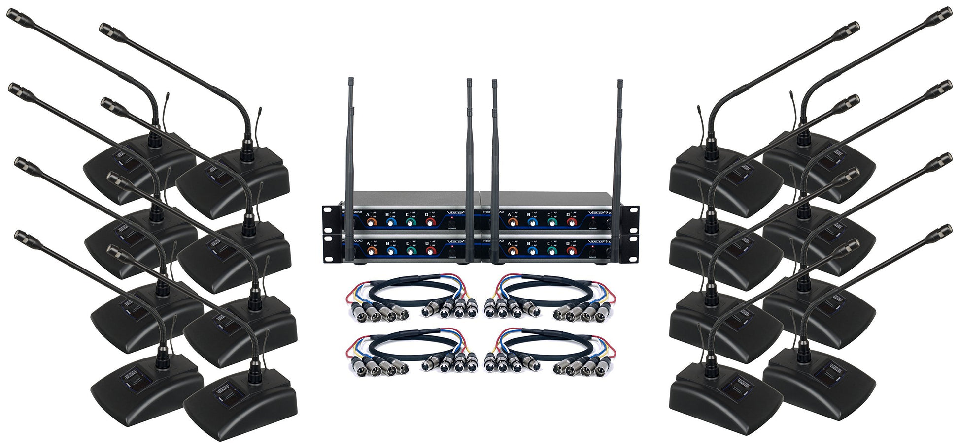 VocoPro Wireless Microphone System (DIGITAL-CONFERENCE-16)Sixteen wireless conference microphones each channel has a Dedicated XLR output and volume controlStable transmission via 900MHz frequency band 24-bit digital Technology delivers a clean, professional quality signal individual digital microphone IDs eliminates channel Cross-TalkWide frequency response (50 - 20, 000 Hz) ensures natural sounding vocals sixteen balanced XLR outputs available four ¼” mixed output Available brackets included for mounting in a rack case